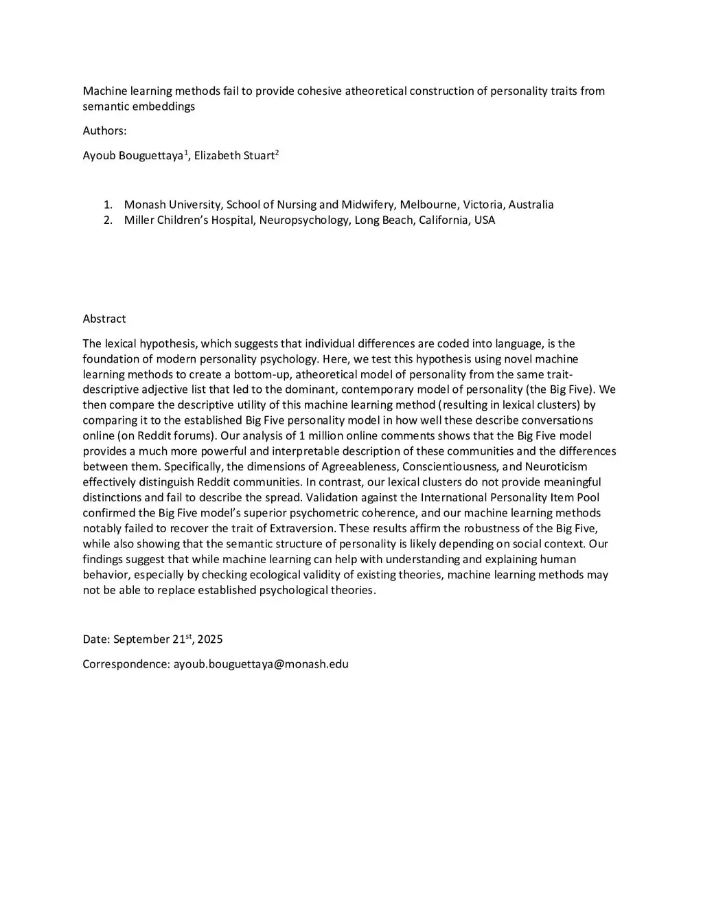 Machine learning methods fail to provide cohesive atheoretical construction of personality traits from semantic embeddings