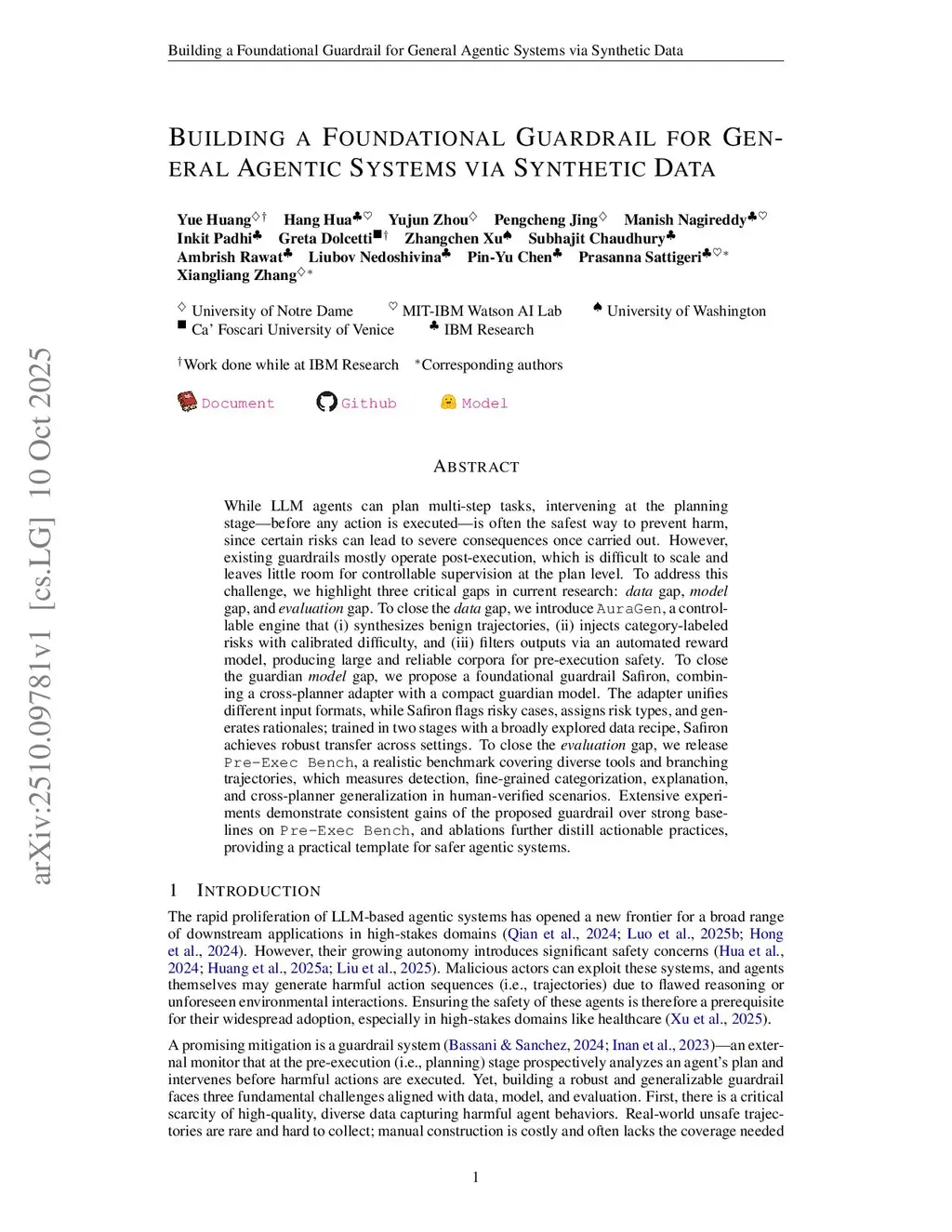 While LLM agents can plan multi-step tasks, intervening at the planning stage-before any action is executed-is often the safest way to prevent harm, since certain risks can lead to severe consequences once carried out. However, existing guardrails mostly operate post-execution, which is difficult to scale and leaves little room for controllable supervision at the plan level. To address this challenge, we highlight three critical gaps in current research: data gap, model gap, and evaluation gap. To close the data gap, we introduce AuraGen, a controllable engine that (i) synthesizes benign trajectories, (ii) injects category-labeled risks with calibrated difficulty, and (iii) filters outputs via an automated reward model, producing large and reliable corpora for pre-execution safety. To close the guardian model gap, we propose a foundational guardrail Safiron, combining a cross-planner adapter with a compact guardian model. The adapter unifies different input formats, while Safiron flags risky cases, assigns risk types, and generates rationales; trained in two stages with a broadly explored data recipe, Safiron achieves robust transfer across settings. To close the evaluation gap, we release Pre-Exec Bench, a realistic benchmark covering diverse tools and branching trajectories, which measures detection, fine-grained categorization, explanation, and cross-planner generalization in human-verified scenarios. Extensive experiments demonstrate consistent gains of the proposed guardrail over strong baselines on Pre-Exec Bench, and ablations further distill actionable practices, providing a practical template for safer agentic systems.