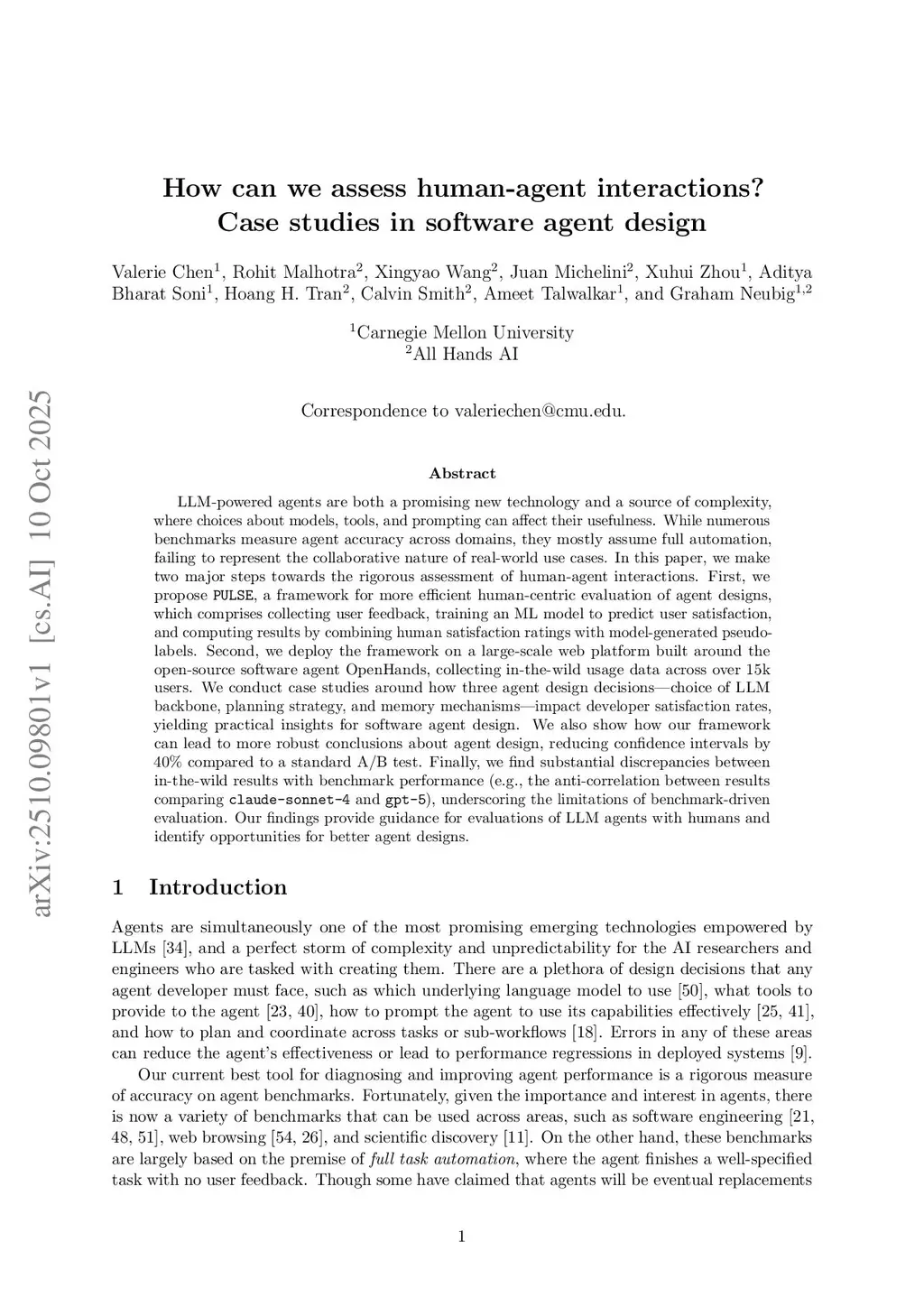 LLM-powered agents are both a promising new technology and a source of complexity, where choices about models, tools, and prompting can affect their usefulness. While numerous benchmarks measure agent accuracy across domains, they mostly assume full automation, failing to represent the collaborative nature of real-world use cases. In this paper, we make two major steps towards the rigorous assessment of human-agent interactions. First, we propose PULSE, a framework for more efficient human-centric evaluation of agent designs, which comprises collecting user feedback, training an ML model to predict user satisfaction, and computing results by combining human satisfaction ratings with model-generated pseudo-labels. Second, we deploy the framework on a large-scale web platform built around the open-source software agent OpenHands, collecting in-the-wild usage data across over 15k users. We conduct case studies around how three agent design decisions -- choice of LLM backbone, planning strategy, and memory mechanisms -- impact developer satisfaction rates, yielding practical insights for software agent design. We also show how our framework can lead to more robust conclusions about agent design, reducing confidence intervals by 40% compared to a standard A/B test. Finally, we find substantial discrepancies between in-the-wild results and benchmark performance (e.g., the anti-correlation between results comparing claude-sonnet-4 and gpt-5), underscoring the limitations of benchmark-driven evaluation. Our findings provide guidance for evaluations of LLM agents with humans and identify opportunities for better agent designs.
