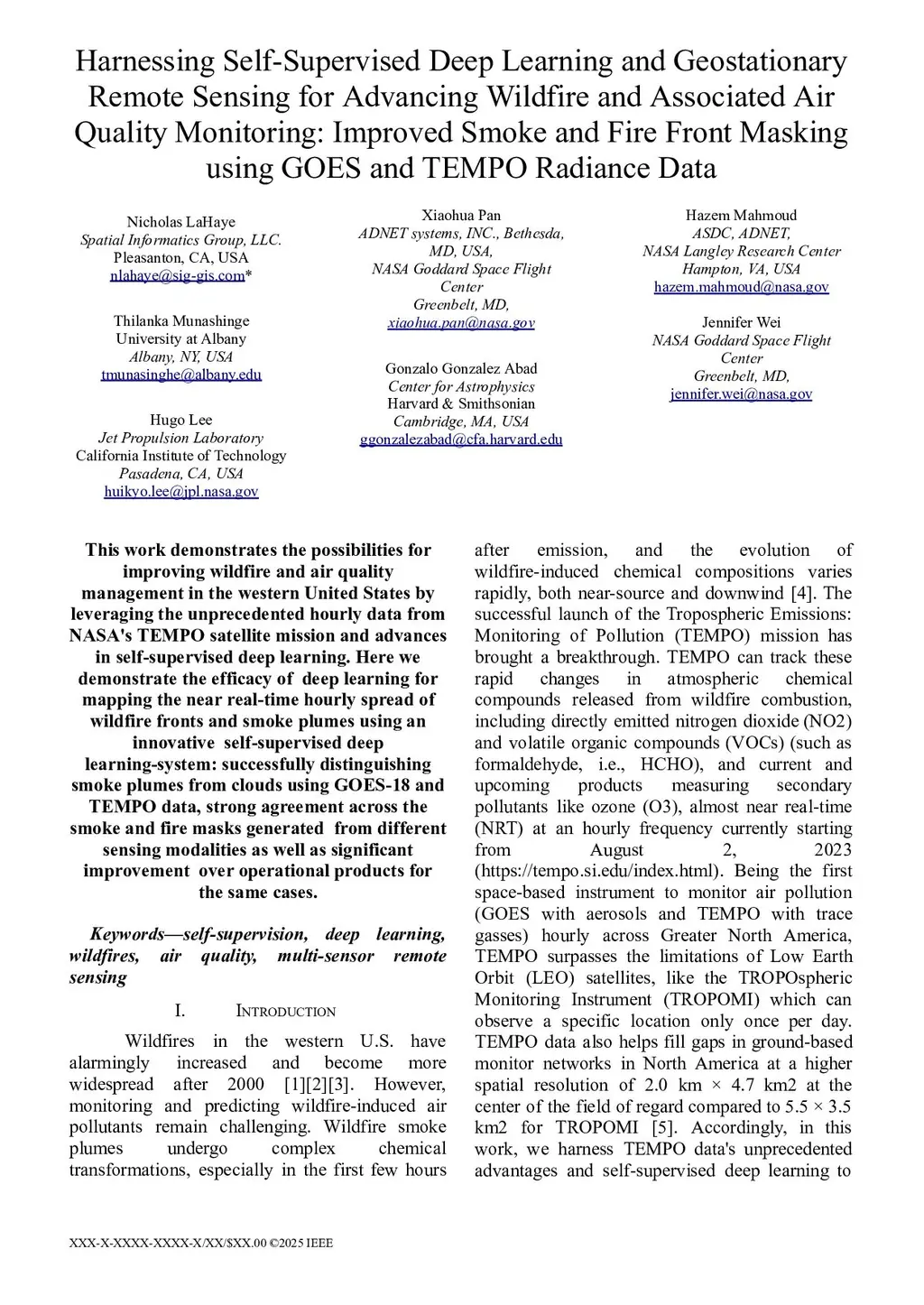 This work demonstrates the possibilities for improving wildfire and air quality management in the western United States by leveraging the unprecedented hourly data from NASA's TEMPO satellite mission and advances in self-supervised deep learning. Here we demonstrate the efficacy of deep learning for mapping the near real-time hourly spread of wildfire fronts and smoke plumes using an innovative self-supervised deep learning-system: successfully distinguishing smoke plumes from clouds using GOES-18 and TEMPO data, strong agreement across the smoke and fire masks generated from different sensing modalities as well as significant improvement over operational products for the same cases.
