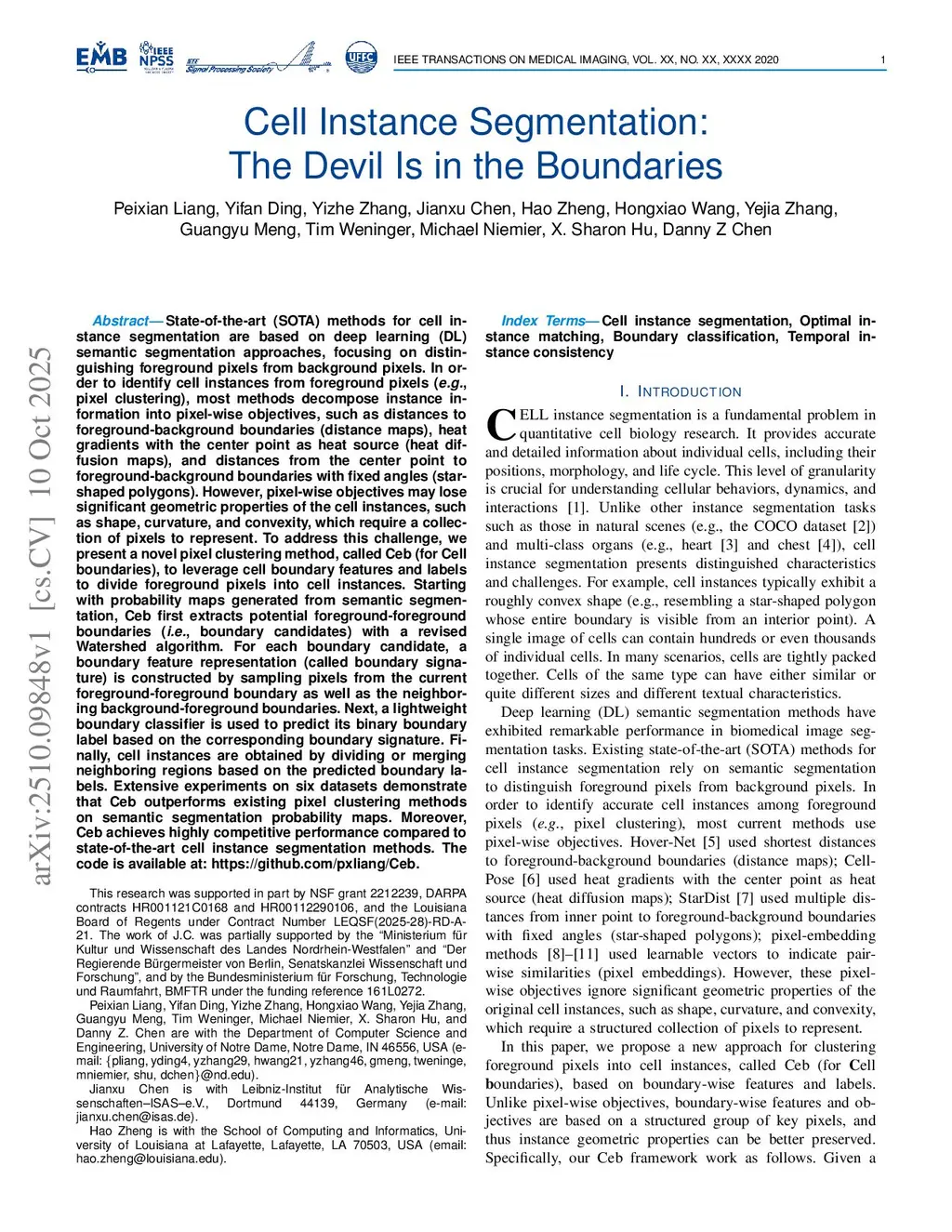 State-of-the-art (SOTA) methods for cell instance segmentation are based on deep learning (DL) semantic segmentation approaches, focusing on distinguishing foreground pixels from background pixels. In order to identify cell instances from foreground pixels (e.g., pixel clustering), most methods decompose instance information into pixel-wise objectives, such as distances to foreground-background boundaries (distance maps), heat gradients with the center point as heat source (heat diffusion maps), and distances from the center point to foreground-background boundaries with fixed angles (star-shaped polygons). However, pixel-wise objectives may lose significant geometric properties of the cell instances, such as shape, curvature, and convexity, which require a collection of pixels to represent. To address this challenge, we present a novel pixel clustering method, called Ceb (for Cell boundaries), to leverage cell boundary features and labels to divide foreground pixels into cell instances. Starting with probability maps generated from semantic segmentation, Ceb first extracts potential foreground-foreground boundaries with a revised Watershed algorithm. For each boundary candidate, a boundary feature representation (called boundary signature) is constructed by sampling pixels from the current foreground-foreground boundary as well as the neighboring background-foreground boundaries. Next, a boundary classifier is used to predict its binary boundary label based on the corresponding boundary signature. Finally, cell instances are obtained by dividing or merging neighboring regions based on the predicted boundary labels. Extensive experiments on six datasets demonstrate that Ceb outperforms existing pixel clustering methods on semantic segmentation probability maps. Moreover, Ceb achieves highly competitive performance compared to SOTA cell instance segmentation methods.