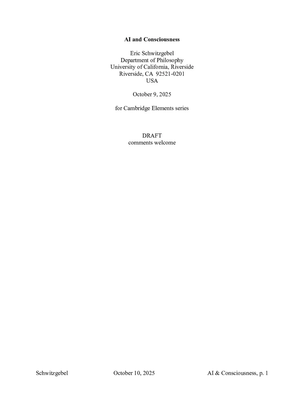 This is a skeptical overview of the literature on AI consciousness. We will soon create AI systems that are conscious according to some influential, mainstream theories of consciousness but are not conscious according to other influential, mainstream theories of consciousness. We will not be in a position to know which theories are correct and whether we are surrounded by AI systems as richly and meaningfully conscious as human beings or instead only by systems as experientially blank as toasters. None of the standard arguments either for or against AI consciousness takes us far.Table of ContentsChapter One: Hills and FogChapter Two: What Is Consciousness? What Is AI?Chapter Three: Ten Possibly Essential Features of ConsciousnessChapter Four: Against Introspective and Conceptual Arguments for Essential FeaturesChapter Five: Materialism and FunctionalismChapter Six: The Turing Test and the Chinese RoomChapter Seven: The Mimicry Argument Against AI ConsciousnessChapter Eight: Global Workspace Theories and Higher Order TheoriesChapter Nine: Integrated Information, Local Recurrence, Associative Learning, and Iterative Natural KindsChapter Ten: Does Biological Substrate Matter?Chapter Eleven: The Leapfrog Hypothesis, Strange Intelligence, and the Social Semi-Solution