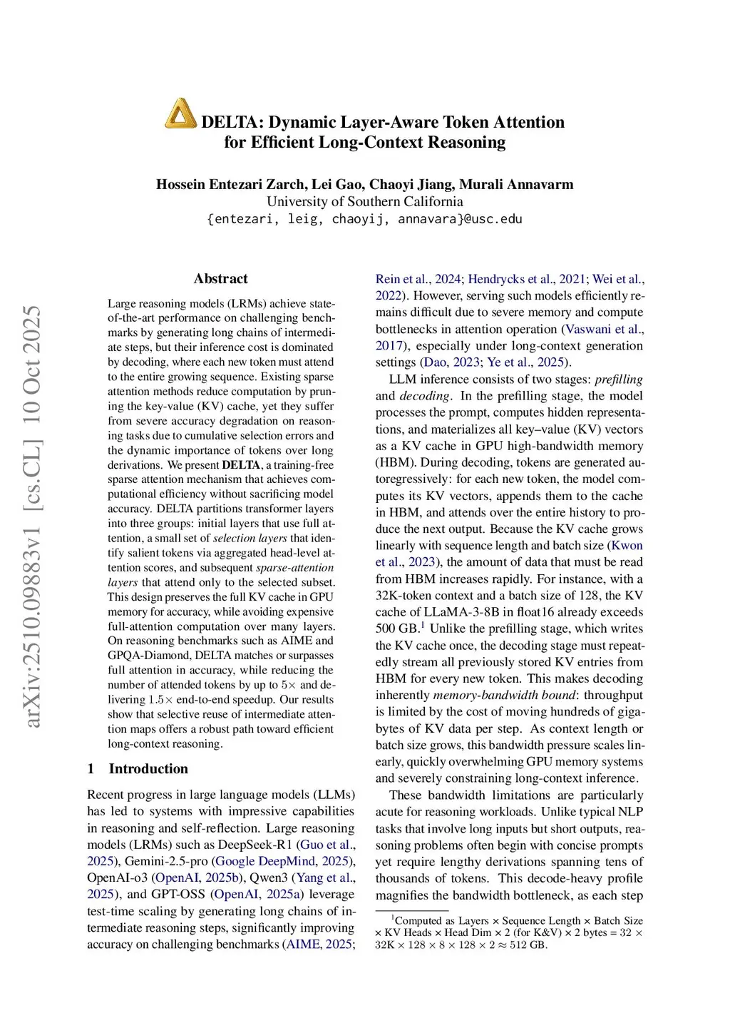 Large reasoning models (LRMs) achieve state-of-the-art performance on challenging benchmarks by generating long chains of intermediate steps, but their inference cost is dominated by decoding, where each new token must attend to the entire growing sequence. Existing sparse attention methods reduce computation by pruning the key-value (KV) cache, yet they suffer from severe accuracy degradation on reasoning tasks due to cumulative selection errors and the dynamic importance of tokens over long derivations. We present \textbf{DELTA}, a training-free sparse attention mechanism that achieves computational efficiency without sacrificing model accuracy. DELTA partitions transformer layers into three groups: initial layers that use full attention, a small set of \emph{selection layers} that identify salient tokens via aggregated head-level attention scores, and subsequent \emph{sparse-attention layers} that attend only to the selected subset. This design preserves the full KV cache in GPU memory for accuracy, while avoiding expensive full-attention computation over many layers. On reasoning benchmarks such as AIME and GPQA-Diamond, DELTA matches or surpasses full attention in accuracy, while reducing the number of attended tokens by up to and delivering end-to-end speedup. Our results show that selective reuse of intermediate attention maps offers a robust path toward efficient long-context reasoning.