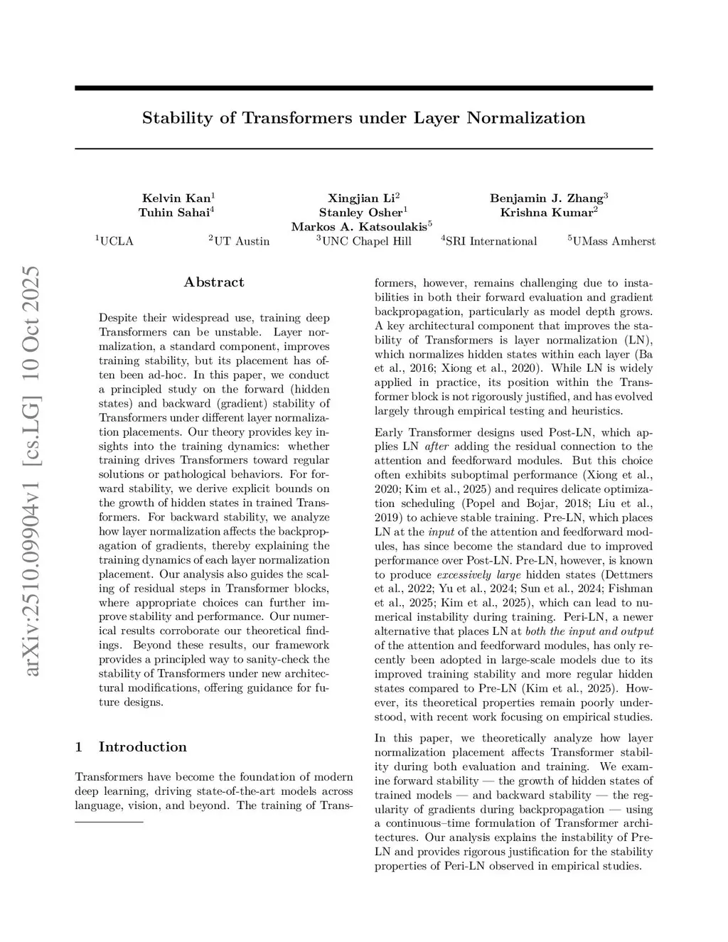 Despite their widespread use, training deep Transformers can be unstable. Layer normalization, a standard component, improves training stability, but its placement has often been ad-hoc. In this paper, we conduct a principled study on the forward (hidden states) and backward (gradient) stability of Transformers under different layer normalization placements. Our theory provides key insights into the training dynamics: whether training drives Transformers toward regular solutions or pathological behaviors. For forward stability, we derive explicit bounds on the growth of hidden states in trained Transformers. For backward stability, we analyze how layer normalization affects the backpropagation of gradients, thereby explaining the training dynamics of each layer normalization placement. Our analysis also guides the scaling of residual steps in Transformer blocks, where appropriate choices can further improve stability and performance. Our numerical results corroborate our theoretical findings. Beyond these results, our framework provides a principled way to sanity-check the stability of Transformers under new architectural modifications, offering guidance for future designs.