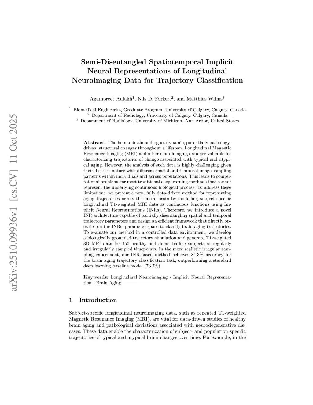 The human brain undergoes dynamic, potentially pathology-driven, structural changes throughout a lifespan. Longitudinal Magnetic Resonance Imaging (MRI) and other neuroimaging data are valuable for characterizing trajectories of change associated with typical and atypical aging. However, the analysis of such data is highly challenging given their discrete nature with different spatial and temporal image sampling patterns within individuals and across populations. This leads to computational problems for most traditional deep learning methods that cannot represent the underlying continuous biological process. To address these limitations, we present a new, fully data-driven method for representing aging trajectories across the entire brain by modelling subject-specific longitudinal T1-weighted MRI data as continuous functions using Implicit Neural Representations (INRs). Therefore, we introduce a novel INR architecture capable of partially disentangling spatial and temporal trajectory parameters and design an efficient framework that directly operates on the INRs' parameter space to classify brain aging trajectories. To evaluate our method in a controlled data environment, we develop a biologically grounded trajectory simulation and generate T1-weighted 3D MRI data for 450 healthy and dementia-like subjects at regularly and irregularly sampled timepoints. In the more realistic irregular sampling experiment, our INR-based method achieves 81.3% accuracy for the brain aging trajectory classification task, outperforming a standard deep learning baseline model (73.7%).