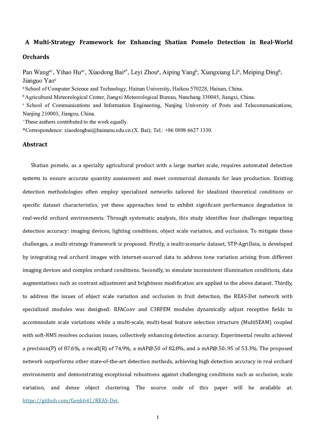 Shatian pomelo detection in orchards is essential for yield estimation and lean production, but models tuned to ideal datasets often degrade in practice due to device-dependent tone shifts, illumination changes, large scale variation, and frequent occlusion. We introduce STP-AgriData, a multi-scenario dataset combining real-orchard imagery with curated web images, and apply contrast/brightness augmentations to emulate unstable lighting. To better address scale and occlusion, we propose REAS-Det, featuring Global-Selective Visibility Convolution (GSV-Conv) that expands the visible feature space under global semantic guidance while retaining efficient spatial aggregation, plus C3RFEM, MultiSEAM, and Soft-NMS for refined separation and localization. On STP-AgriData, REAS-Det achieves 86.5% precision, 77.2% recall, 84.3% mAP@0.50, and 53.6% mAP@0.50:0.95, outperforming recent detectors and improving robustness in real orchard environments. The source code is available at:this https URL.