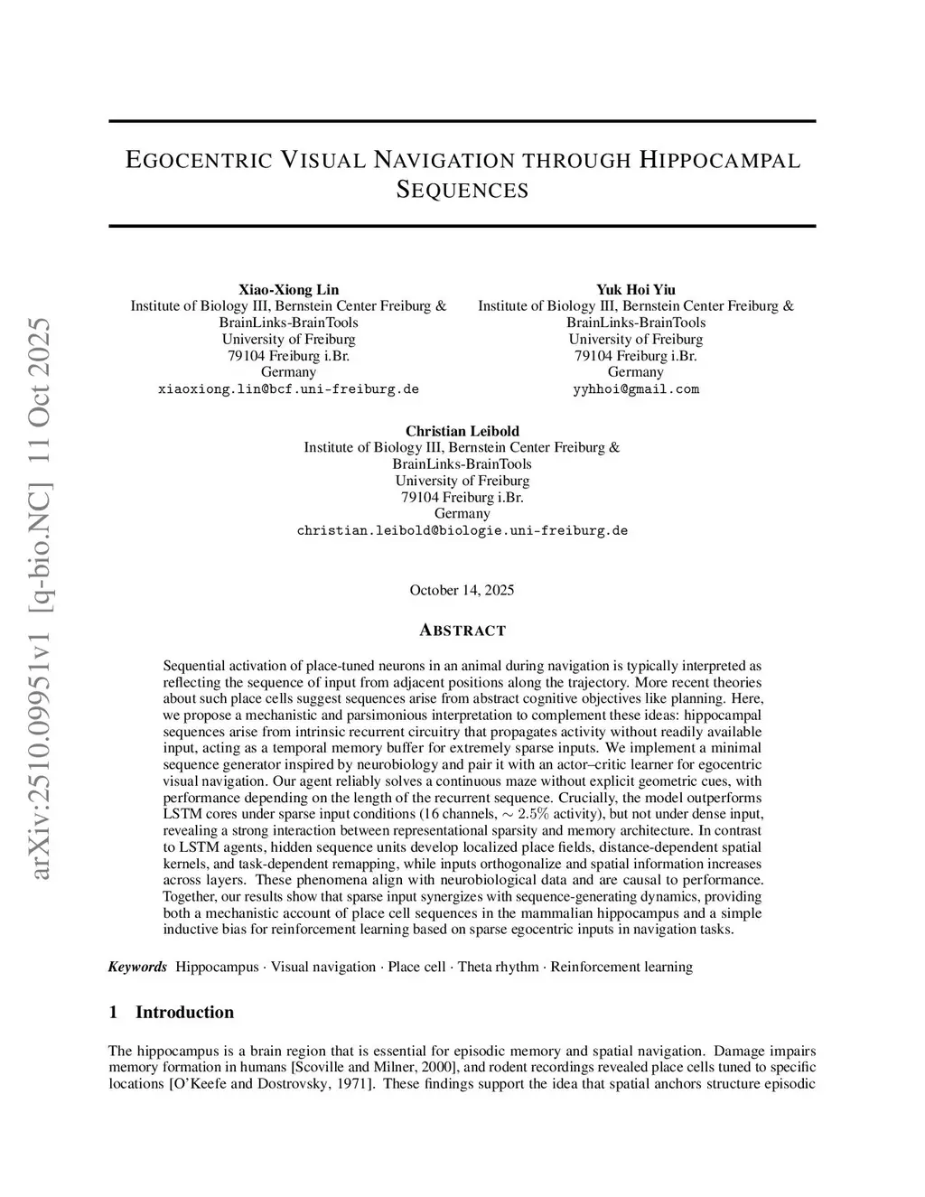 Sequential firing of hippocampal place cells is often attributed to sequential sensory drive along a trajectory, and has also been attributed to planning and other cognitive functions. Here, we propose a mechanistic and parsimonious interpretation to complement these ideas: hippocampal sequences arise from intrinsic recurrent circuitry that propagates transient input over long horizons, acting as a temporal memory buffer that is especially useful when reliable sensory evidence is sparse. We implement this idea with a minimal sequence generator inspired by neurobiology and pair it with an actor-critic learner for egocentric visual navigation. Our agent reliably solves a continuous maze without explicit geometric cues, with performance depending on the length of the recurrent sequence. Crucially, the model outperforms LSTM cores under sparse input conditions (16 channels, activity), but not under dense input, revealing a strong interaction between representational sparsity and memory architecture. Through learning, units develop localized place fields, distance-dependent spatial kernels, and task-dependent remapping, while inputs to the sequence generator orthogonalize and spatial information increases across layers. These phenomena align with neurobiological data and are causal to performance. Together, our results show that sparse input synergizes with sequence-generating dynamics, providing both a mechanistic account of place cell sequences in the mammalian hippocampus and a simple inductive bias for reinforcement learning based on sparse egocentric inputs in navigation tasks.