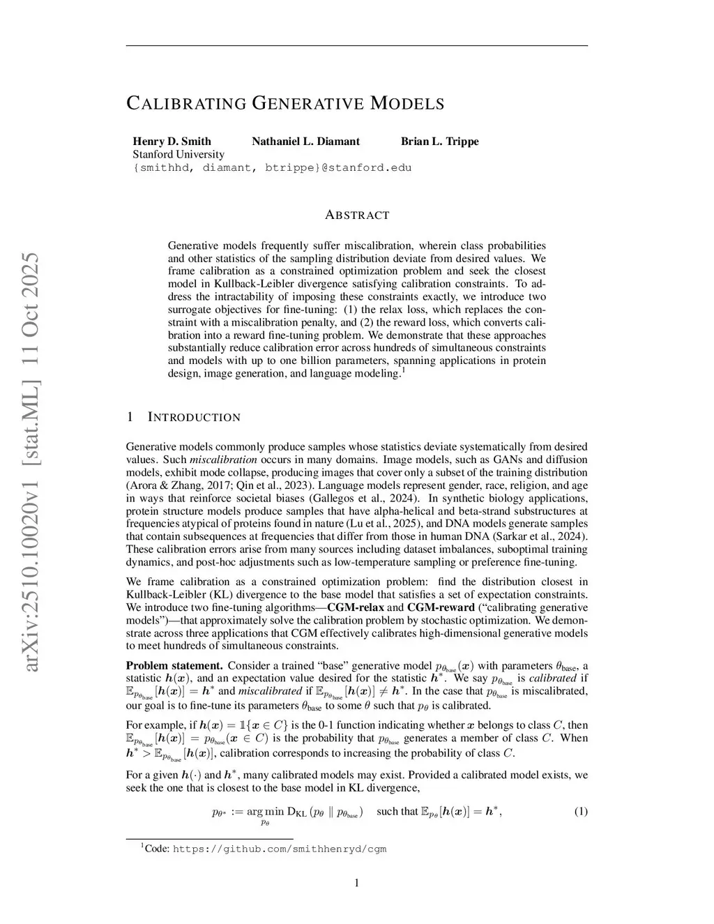 Generative models frequently suffer miscalibration, wherein statistics of the sampling distribution such as class probabilities deviate from desired values. We frame calibration as a constrained optimization problem and seek the closest model in Kullback-Leibler divergence satisfying calibration constraints. To address the intractability of imposing these constraints exactly, we introduce two surrogate objectives for fine-tuning: (1) the relax loss, which replaces the constraint with a miscalibration penalty, and (2) the reward loss, which converts calibration into a reward fine-tuning problem. We demonstrate that these approaches substantially reduce calibration error across hundreds of simultaneous constraints and models with up to one billion parameters, spanning applications in protein design, image generation, and language modeling.