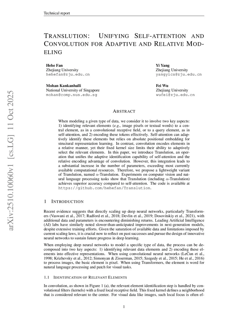 When modeling a given type of data, we consider it to involve two key aspects: 1) identifying relevant elements (e.g., image pixels or textual words) to a central element, as in a convolutional receptive field, or to a query element, as in self-attention, and 2) encoding these tokens effectively. Self-attention can adaptively identify these elements but relies on absolute positional embedding for structural representation learning. In contrast, convolution encodes elements in a relative manner, yet their fixed kernel size limits their ability to adaptively select the relevant elements. In this paper, we introduce Translution, an operation that unifies the adaptive identification capability of self-attention and the relative encoding advantage of convolution. However, this integration leads to a substantial increase in the number of parameters, exceeding most currently available computational resources. Therefore, we propose a lightweight variant of Translution, named {\alpha}-Translution. Experiments on computer vision and natural language processing tasks show that Translution (including {\alpha}-Translution) achieves superior accuracy compared to self-attention. The code is available atthis https URL.
