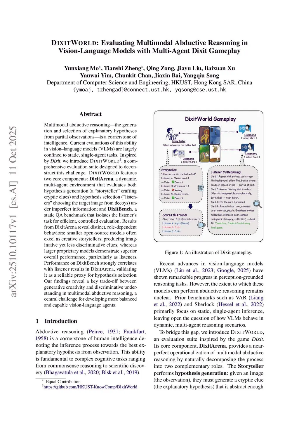 Multimodal abductive reasoning--the generation and selection of explanatory hypotheses from partial observations--is a cornerstone of intelligence. Current evaluations of this ability in vision-language models (VLMs) are largely confined to static, single-agent tasks. Inspired by Dixit, we introduce DixitWorld, a comprehensive evaluation suite designed to deconstruct this challenge. DIXITWORLD features two core components: DixitArena, a dynamic, multi-agent environment that evaluates both hypothesis generation (a "storyteller" crafting cryptic clues) and hypothesis selection ("listeners" choosing the target image from decoys) under imperfect information; and DixitBench, a static QA benchmark that isolates the listener's task for efficient, controlled evaluation. Results from DixitArena reveal distinct, role-dependent behaviors: smaller open-source models often excel as creative storytellers, producing imaginative yet less discriminative clues, whereas larger proprietary models demonstrate superior overall performance, particularly as listeners. Performance on DixitBench strongly correlates with listener results in DixitArena, validating it as a reliable proxy for hypothesis selection. Our findings reveal a key trade-off between generative creativity and discriminative understanding in multimodal abductive reasoning, a central challenge for developing more balanced and capable vision-language agents.