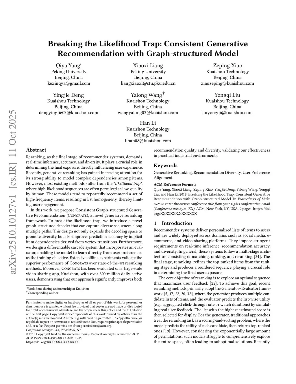 Reranking, as the final stage of recommender systems, demands real-time inference, accuracy, and diversity. It plays a crucial role in determining the final exposure, directly influencing user experience. Recently, generative reranking has gained increasing attention for its strong ability to model complex dependencies among items. However, most existing methods suffer from the "likelihood trap", where high-likelihood sequences are often perceived as low-quality by humans. These models tend to repeatedly recommend a set of high-frequency items, resulting in list homogeneity, thereby limiting user engagement. In this work, we propose Consistent Graph-structured Generative Recommendation (Congrats), a novel generative reranking framework. To break the likelihood trap, we introduce a novel graph-structured decoder that can capture diverse sequences along multiple paths. This design not only expands the decoding space to promote diversity, but also improves prediction accuracy by implicit item dependencies derived from vertex transitions. Furthermore, we design a differentiable cascade system that incorporates an evaluator, enabling the model to learn directly from user preferences as the training objective. Extensive offline experiments validate the superior performance of Congrats over state-of-the-art reranking methods. Moreover, Congrats has been evaluated on a large-scale video-sharing app, Kuaishou, with over 300 million daily active users, demonstrating that our approach significantly improves both recommendation quality and diversity, validating our effectiveness in practical industrial environments.
