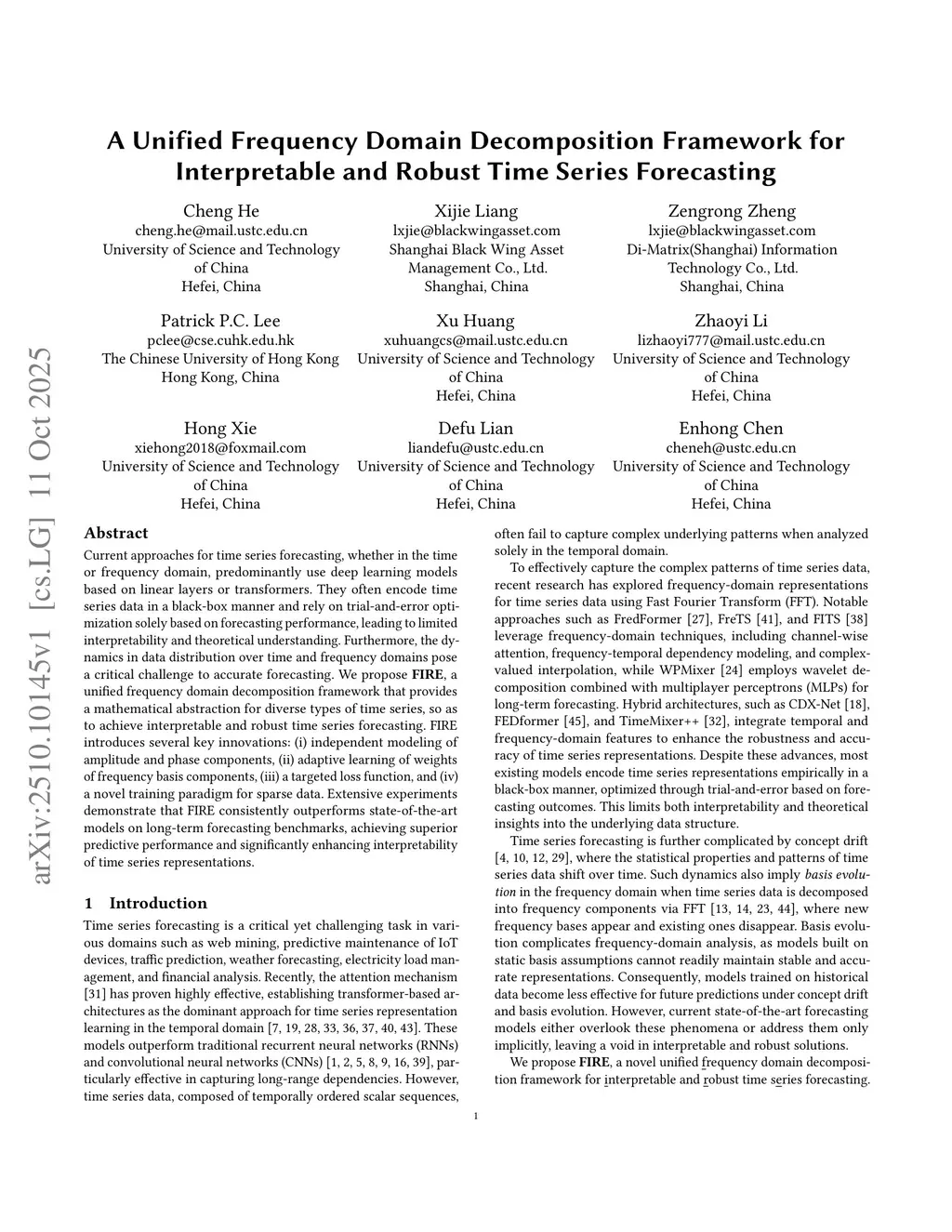 Current approaches for time series forecasting, whether in the time or frequency domain, predominantly use deep learning models based on linear layers or transformers. They often encode time series data in a black-box manner and rely on trial-and-error optimization solely based on forecasting performance, leading to limited interpretability and theoretical understanding. Furthermore, the dynamics in data distribution over time and frequency domains pose a critical challenge to accurate forecasting. We propose FIRE, a unified frequency domain decomposition framework that provides a mathematical abstraction for diverse types of time series, so as to achieve interpretable and robust time series forecasting. FIRE introduces several key innovations: (i) independent modeling of amplitude and phase components, (ii) adaptive learning of weights of frequency basis components, (iii) a targeted loss function, and (iv) a novel training paradigm for sparse data. Extensive experiments demonstrate that FIRE consistently outperforms state-of-the-art models on long-term forecasting benchmarks, achieving superior predictive performance and significantly enhancing interpretability of time series