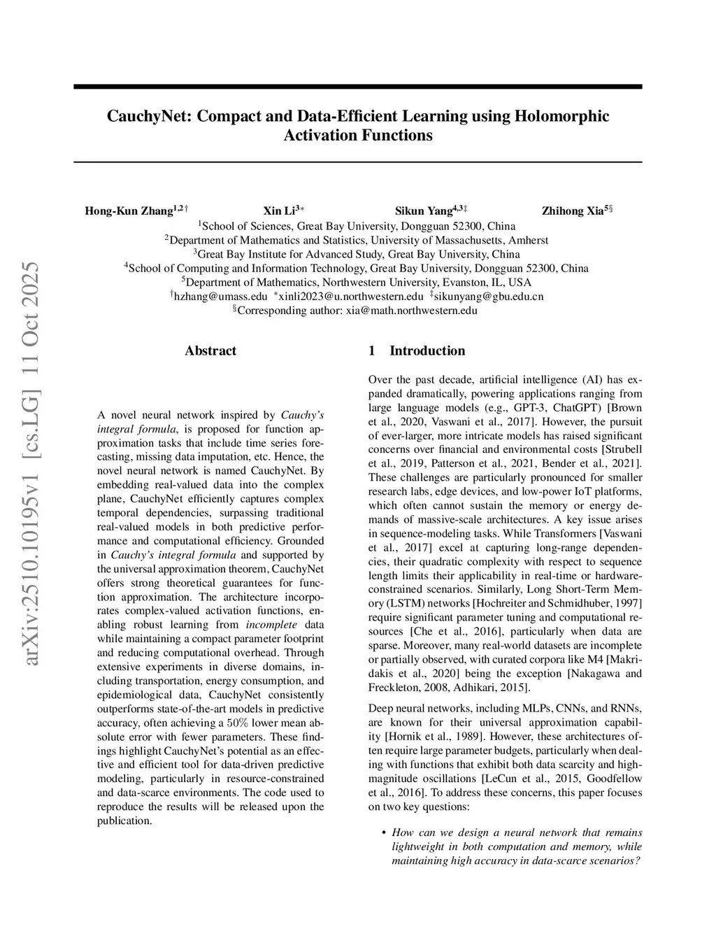 A novel neural network inspired by Cauchy's integral formula, is proposed for function approximation tasks that include time series forecasting, missing data imputation, etc. Hence, the novel neural network is named CauchyNet. By embedding real-valued data into the complex plane, CauchyNet efficiently captures complex temporal dependencies, surpassing traditional real-valued models in both predictive performance and computational efficiency. Grounded in Cauchy's integral formula and supported by the universal approximation theorem, CauchyNet offers strong theoretical guarantees for function approximation. The architecture incorporates complex-valued activation functions, enabling robust learning from incomplete data while maintaining a compact parameter footprint and reducing computational overhead. Through extensive experiments in diverse domains, including transportation, energy consumption, and epidemiological data, CauchyNet consistently outperforms state-of-the-art models in predictive accuracy, often achieving a 50% lower mean absolute error with fewer parameters. These findings highlight CauchyNet's potential as an effective and efficient tool for data-driven predictive modeling, particularly in resource-constrained and data-scarce environments.