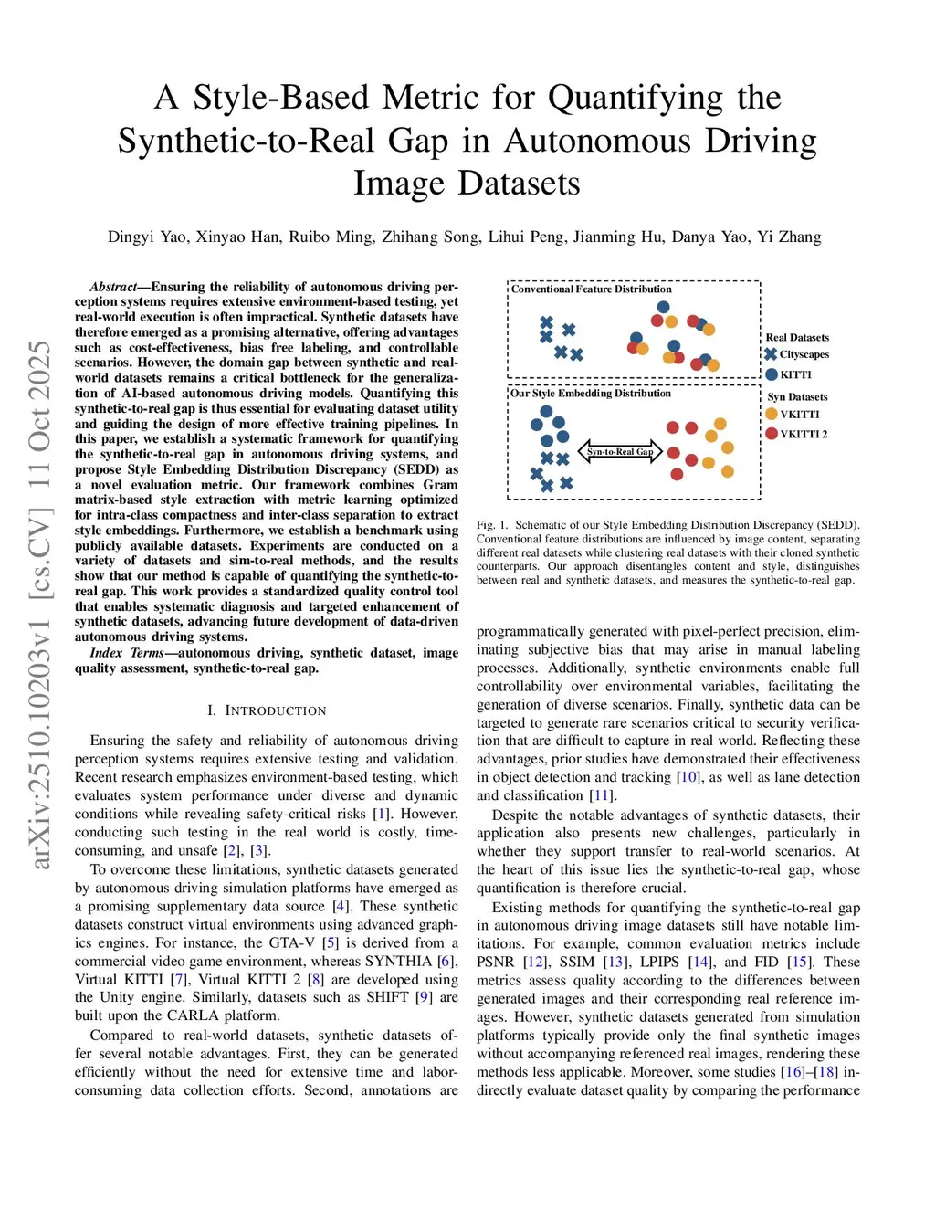 Ensuring the reliability of autonomous driving perception systems requires extensive environment-based testing, yet real-world execution is often impractical. Synthetic datasets have therefore emerged as a promising alternative, offering advantages such as cost-effectiveness, bias free labeling, and controllable scenarios. However, the domain gap between synthetic and real-world datasets remains a critical bottleneck for the generalization of AI-based autonomous driving models. Quantifying this synthetic-to-real gap is thus essential for evaluating dataset utility and guiding the design of more effective training pipelines. In this paper, we establish a systematic framework for quantifying the synthetic-to-real gap in autonomous driving systems, and propose Style Embedding Distribution Discrepancy (SEDD) as a novel evaluation metric. Our framework combines Gram matrix-based style extraction with metric learning optimized for intra-class compactness and inter-class separation to extract style embeddings. Furthermore, we establish a benchmark using publicly available datasets. Experiments are conducted on a variety of datasets and sim-to-real methods, and the results show that our method is capable of quantifying the synthetic-to-real gap. This work provides a standardized quality control tool that enables systematic diagnosis and targeted enhancement of synthetic datasets, advancing future development of data-driven autonomous driving systems.