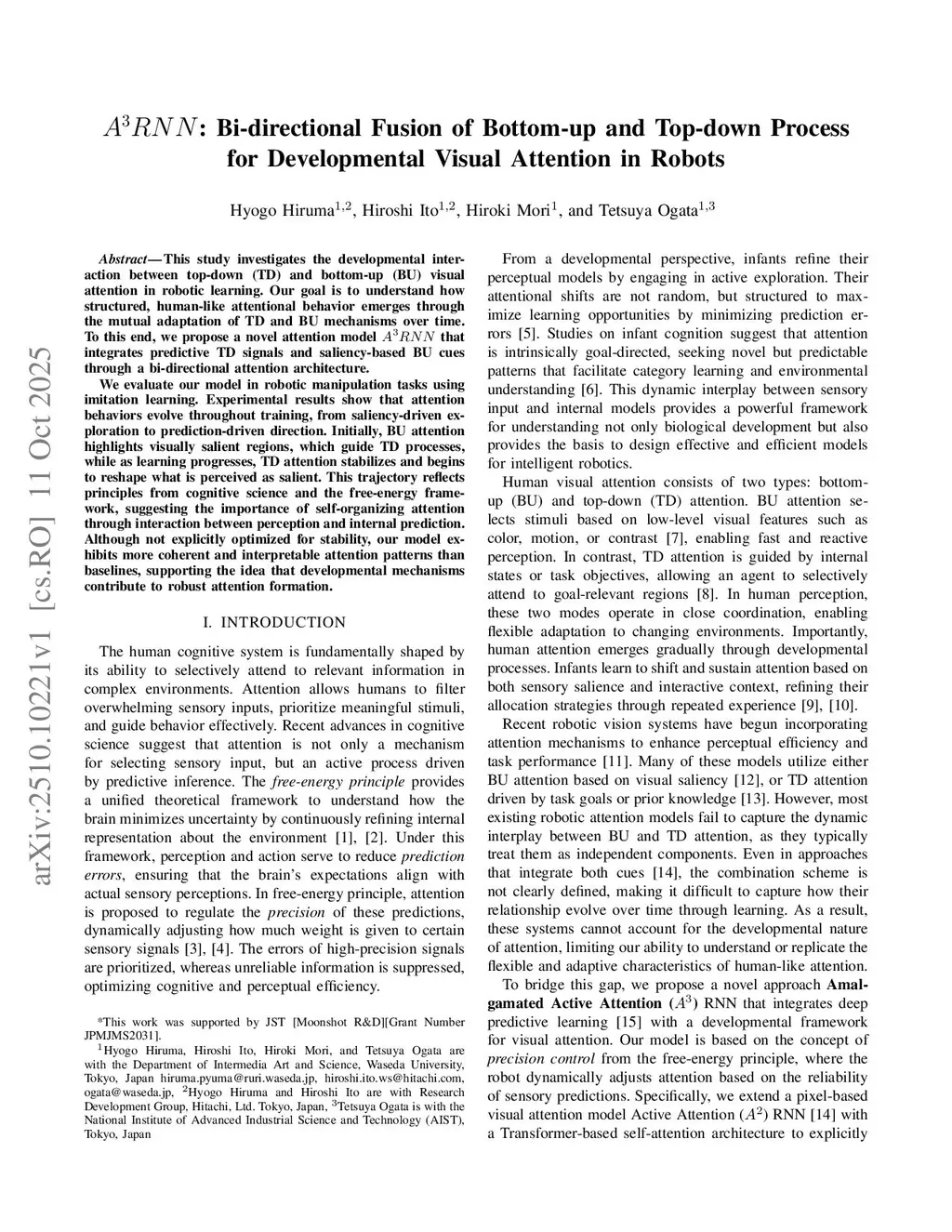 A3RNN: Bi-directional Fusion of Bottom-up and Top-down Process for Developmental Visual Attention in Robots