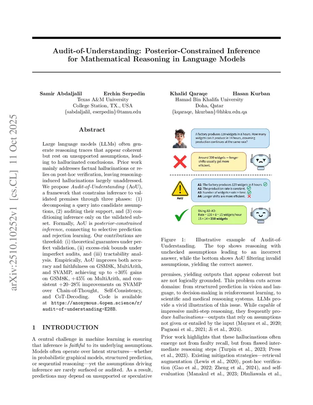 Large language models (LLMs) often generate reasoning traces that appear coherent but rest on unsupported assumptions, leading to hallucinated conclusions. Prior work mainly addresses factual hallucinations or relies on post-hoc verification, leaving reasoning-induced hallucinations largely unaddressed. We propose Audit-of-Understanding (AoU), a framework that constrains inference to validated premises through three phases: (1) decomposing a query into candidate assumptions, (2) auditing their support, and (3) conditioning inference only on the validated subset. Formally, AoU is \emph{posterior-constrained inference}, connecting to selective prediction and rejection learning. Our contributions are threefold: (i) theoretical guarantees under perfect validation, (ii) excess-risk bounds under imperfect audits, and (iii) tractability analysis. Empirically, AoU improves both accuracy and faithfulness on GSM8K, MultiArith, and SVAMP, achieving up to +30% gains on GSM8K, +45% on MultiArith, and consistent +20--28% improvements on SVAMP over Chain-of-Thought, Self-Consistency, and CoT-Decoding. Code is available atthis https URL.