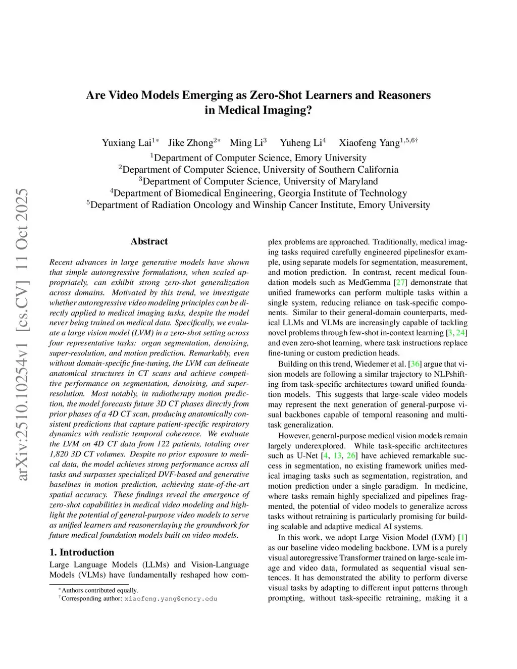 Recent advances in large generative models have shown that simple autoregressive formulations, when scaled appropriately, can exhibit strong zero-shot generalization across domains. Motivated by this trend, we investigate whether autoregressive video modeling principles can be directly applied to medical imaging tasks, despite the model never being trained on medical data. Specifically, we evaluate a large vision model (LVM) in a zero-shot setting across four representative tasks: organ segmentation, denoising, super-resolution, and motion prediction. Remarkably, even without domain-specific fine-tuning, the LVM can delineate anatomical structures in CT scans and achieve competitive performance on segmentation, denoising, and super-resolution. Most notably, in radiotherapy motion prediction, the model forecasts future 3D CT phases directly from prior phases of a 4D CT scan, producing anatomically consistent predictions that capture patient-specific respiratory dynamics with realistic temporal coherence. We evaluate the LVM on 4D CT data from 122 patients, totaling over 1,820 3D CT volumes. Despite no prior exposure to medical data, the model achieves strong performance across all tasks and surpasses specialized DVF-based and generative baselines in motion prediction, achieving state-of-the-art spatial accuracy. These findings reveal the emergence of zero-shot capabilities in medical video modeling and highlight the potential of general-purpose video models to serve as unified learners and reasoners laying the groundwork for future medical foundation models built on video models.