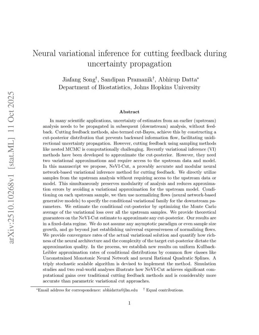 In many scientific applications, uncertainty of estimates from an earlier (upstream) analysis needs to be propagated in subsequent (downstream) Bayesian analysis, without feedback. Cutting feedback methods, also termed cut-Bayes, achieve this by constructing a cut-posterior distribution that prevents backward information flow. Cutting feedback like nested MCMC is computationally challenging while variational inference (VI) cut-Bayes methods need two variational approximations and require access to the upstream data and model. In this manuscript we propose, NeVI-Cut, a provably accurate and modular neural network-based variational inference method for cutting feedback. We directly utilize samples from the upstream analysis without requiring access to the upstream data or model. This simultaneously preserves modularity of analysis and reduces approximation errors by avoiding a variational approximation for the upstream model. We then use normalizing flows to specify the conditional variational family for the downstream parameters and estimate the conditional cut-posterior as a variational solution of Monte Carlo average loss over all the upstream samples. We provide theoretical guarantees on the NeVI-Cut estimate to approximate any cut-posterior. Our results are in a fixed-data regime and provide convergence rates of the actual variational solution, quantifying how richness of the neural architecture and the complexity of the target cut-posterior dictate the approximation quality. In the process, we establish new results on uniform Kullback-Leibler approximation rates of conditional normalizing flows. Simulation studies and two real-world analyses illustrate how NeVI-Cut achieves significant computational gains over traditional cutting feedback methods and is considerably more accurate than parametric variational cut approaches.