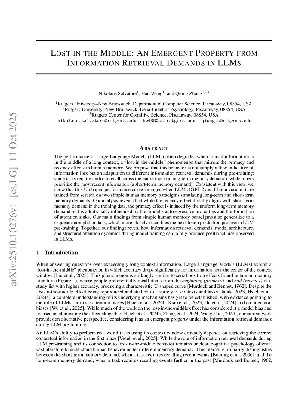 Lost in the Middle: An Emergent Property from Information Retrieval Demands in LLMs
