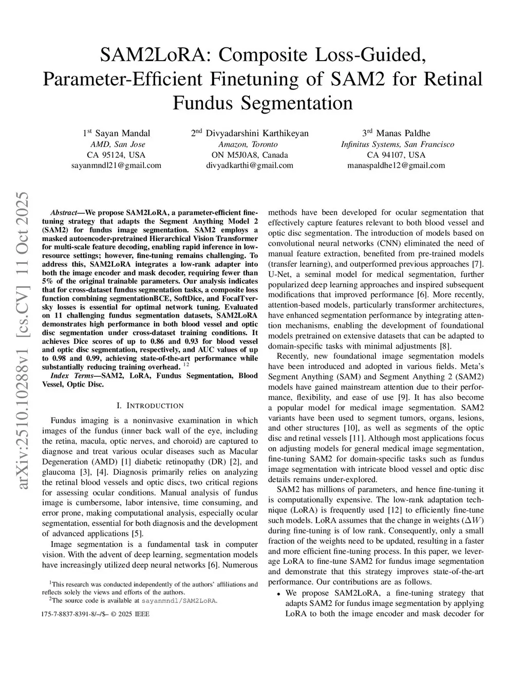SAM2LoRA: Composite Loss-Guided, Parameter-Efficient Finetuning of SAM2 for Retinal Fundus Segmentation