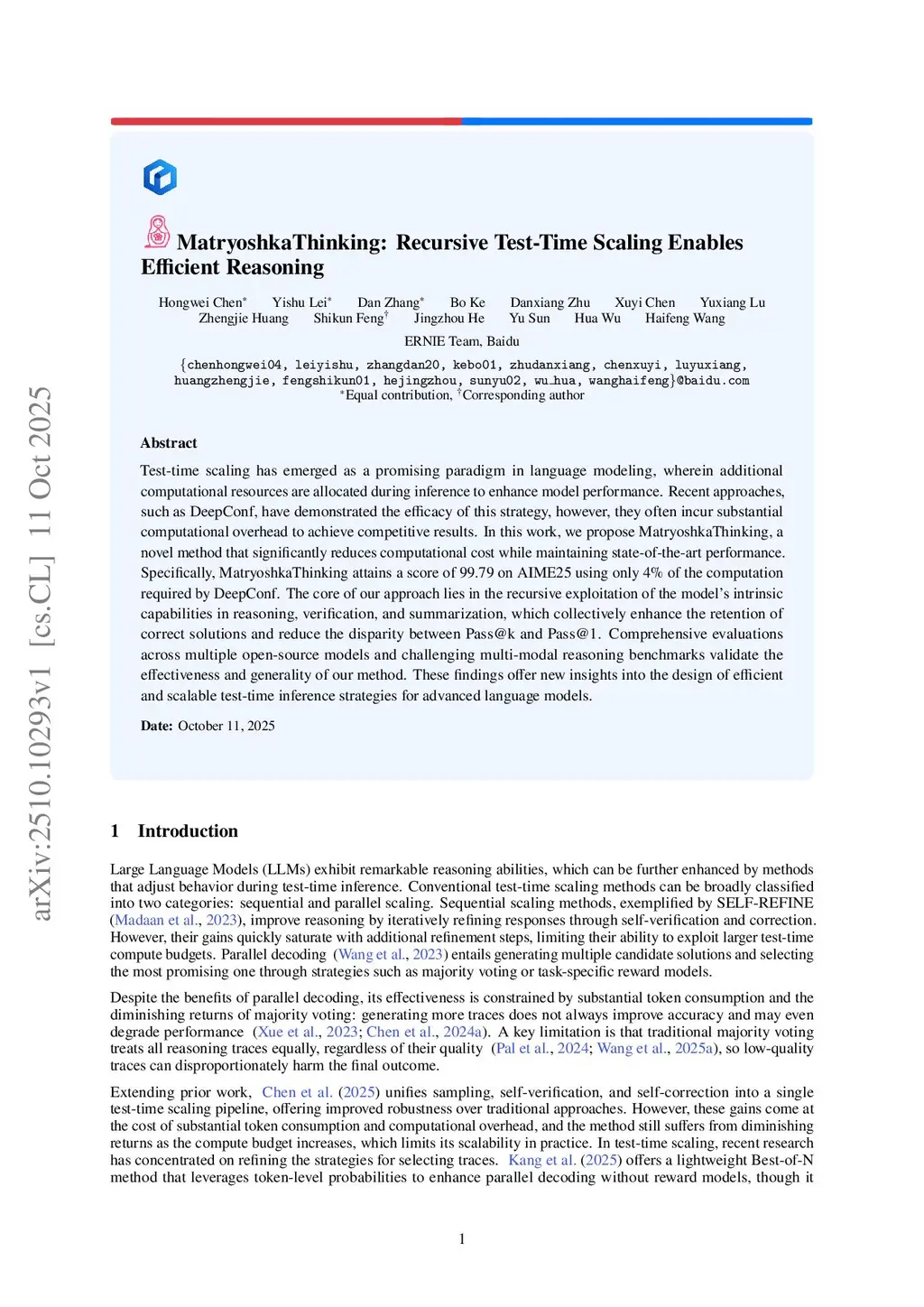 Test-time scaling has emerged as a promising paradigm in language modeling, wherein additional computational resources are allocated during inference to enhance model performance. Recent approaches, such as DeepConf, have demonstrated the efficacy of this strategy, however, they often incur substantial computational overhead to achieve competitive results. In this work, we propose MatryoshkaThinking, a novel method that significantly reduces computational cost while maintaining state-of-the-art performance. Specifically, MatryoshkaThinking attains a score of 99.79 on AIME2025 using only 4% of the computation required by DeepConf. The core of our approach lies in the recursive exploitation of the model's intrinsic capabilities in reasoning, verification, and summarization, which collectively enhance the retention of correct solutions and reduce the disparity between Pass@k and Pass@1. Comprehensive evaluations across multiple open-source models and challenging multi-modal reasoning benchmarks validate the effectiveness and generality of our method. These findings offer new insights into the design of efficient and scalable test-time inference strategies for advanced language models.
