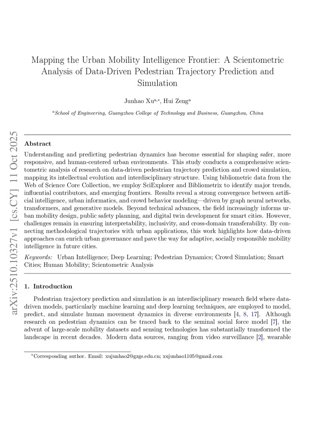 Understanding and predicting pedestrian dynamics has become essential for shaping safer, more responsive, and human-centered urban environments. This study conducts a comprehensive scientometric analysis of research on data-driven pedestrian trajectory prediction and crowd simulation, mapping its intellectual evolution and interdisciplinary structure. Using bibliometric data from the Web of Science Core Collection, we employ SciExplorer and Bibliometrix to identify major trends, influential contributors, and emerging frontiers. Results reveal a strong convergence between artificial intelligence, urban informatics, and crowd behavior modeling--driven by graph neural networks, transformers, and generative models. Beyond technical advances, the field increasingly informs urban mobility design, public safety planning, and digital twin development for smart cities. However, challenges remain in ensuring interpretability, inclusivity, and cross-domain transferability. By connecting methodological trajectories with urban applications, this work highlights how data-driven approaches can enrich urban governance and pave the way for adaptive, socially responsible mobility intelligence in future cities.