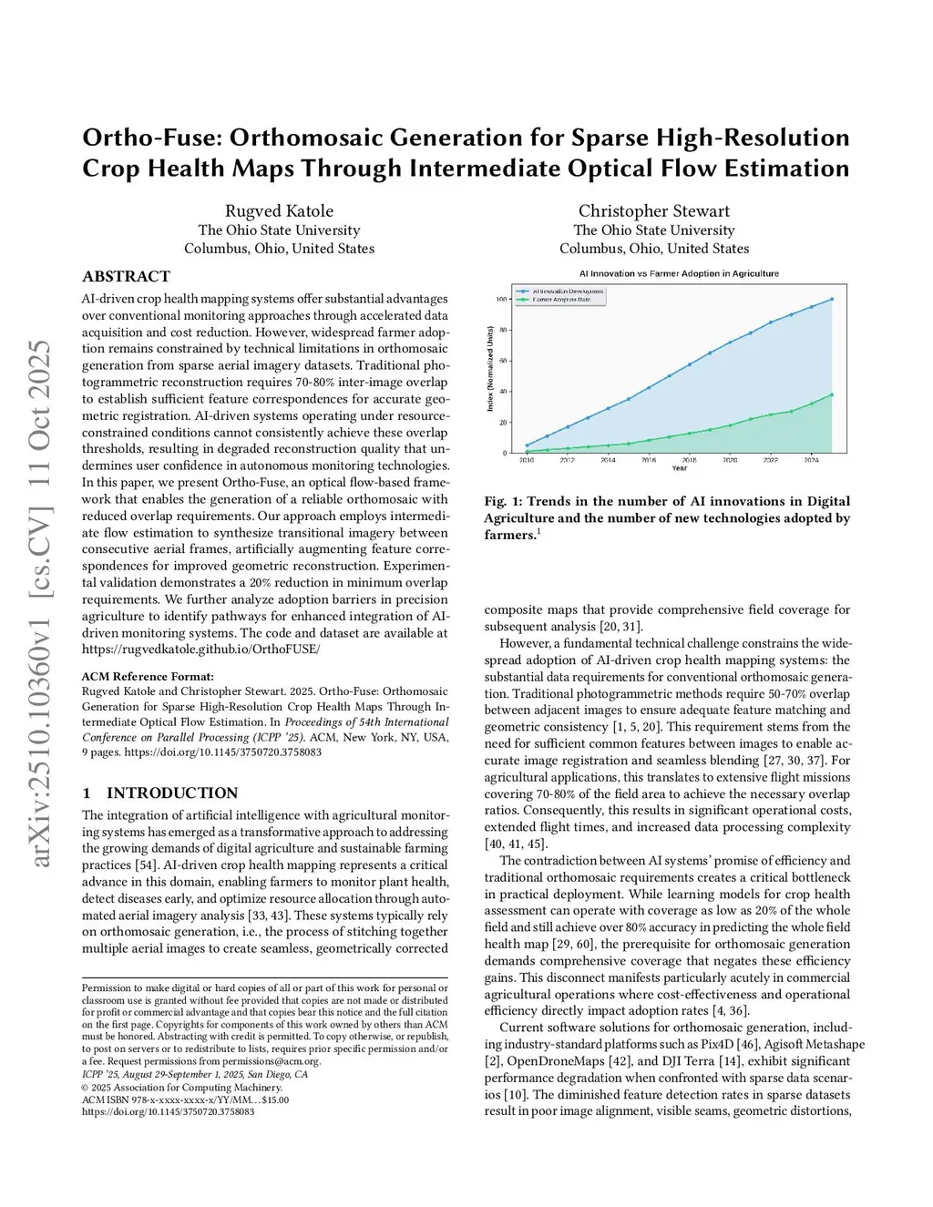 AI-driven crop health mapping systems offer substantial advantages over conventional monitoring approaches through accelerated data acquisition and cost reduction. However, widespread farmer adoption remains constrained by technical limitations in orthomosaic generation from sparse aerial imagery datasets. Traditional photogrammetric reconstruction requires 70-80\% inter-image overlap to establish sufficient feature correspondences for accurate geometric registration. AI-driven systems operating under resource-constrained conditions cannot consistently achieve these overlap thresholds, resulting in degraded reconstruction quality that undermines user confidence in autonomous monitoring technologies. In this paper, we present Ortho-Fuse, an optical flow-based framework that enables the generation of a reliable orthomosaic with reduced overlap requirements. Our approach employs intermediate flow estimation to synthesize transitional imagery between consecutive aerial frames, artificially augmenting feature correspondences for improved geometric reconstruction. Experimental validation demonstrates a 20\% reduction in minimum overlap requirements. We further analyze adoption barriers in precision agriculture to identify pathways for enhanced integration of AI-driven monitoring systems.