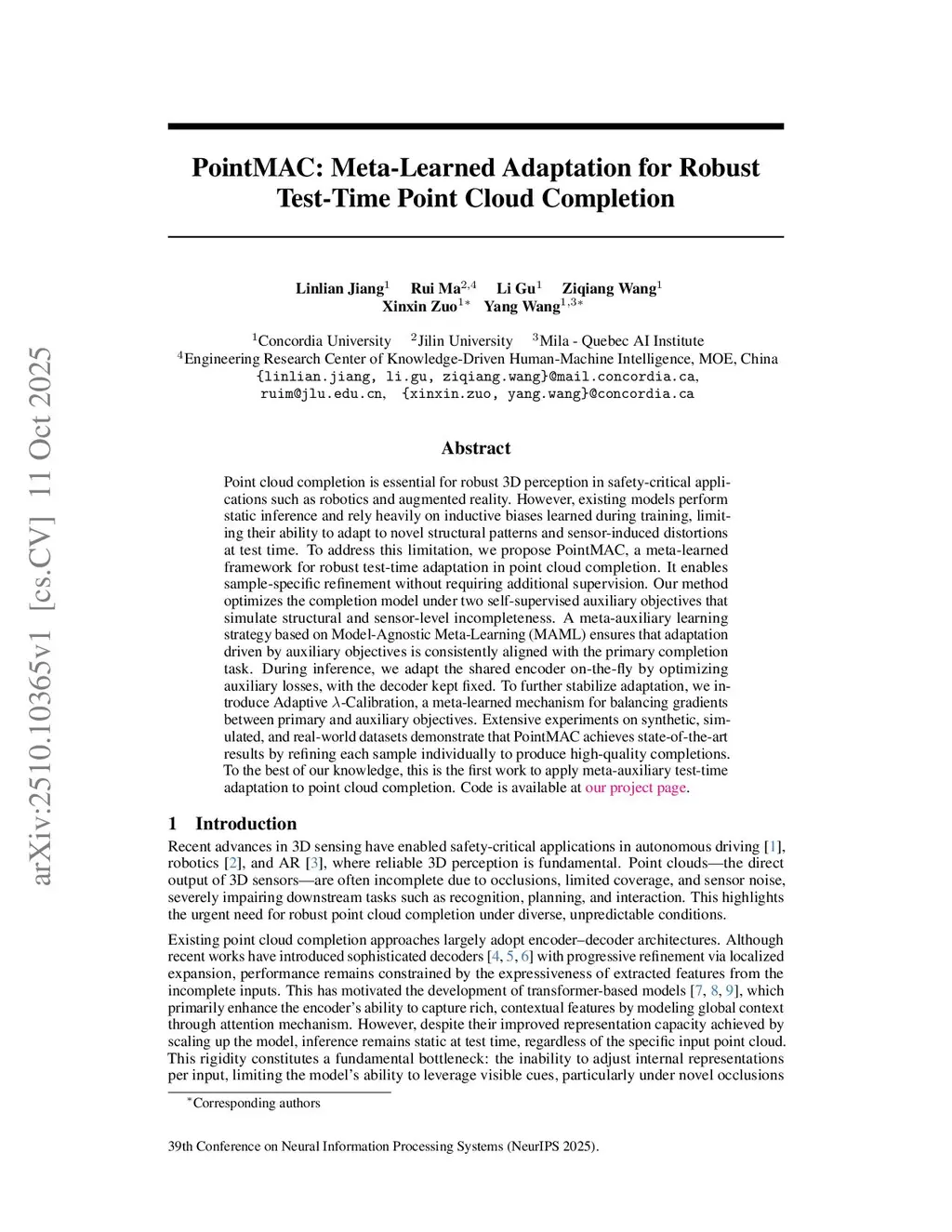 Point cloud completion is essential for robust 3D perception in safety-critical applications such as robotics and augmented reality. However, existing models perform static inference and rely heavily on inductive biases learned during training, limiting their ability to adapt to novel structural patterns and sensor-induced distortions at test time. To address this limitation, we propose PointMAC, a meta-learned framework for robust test-time adaptation in point cloud completion. It enables sample-specific refinement without requiring additional supervision. Our method optimizes the completion model under two self-supervised auxiliary objectives that simulate structural and sensor-level incompleteness. A meta-auxiliary learning strategy based on Model-Agnostic Meta-Learning (MAML) ensures that adaptation driven by auxiliary objectives is consistently aligned with the primary completion task. During inference, we adapt the shared encoder on-the-fly by optimizing auxiliary losses, with the decoder kept fixed. To further stabilize adaptation, we introduce Adaptive -Calibration, a meta-learned mechanism for balancing gradients between primary and auxiliary objectives. Extensive experiments on synthetic, simulated, and real-world datasets demonstrate that PointMAC achieves state-of-the-art results by refining each sample individually to produce high-quality completions. To the best of our knowledge, this is the first work to apply meta-auxiliary test-time adaptation to point cloud completion.