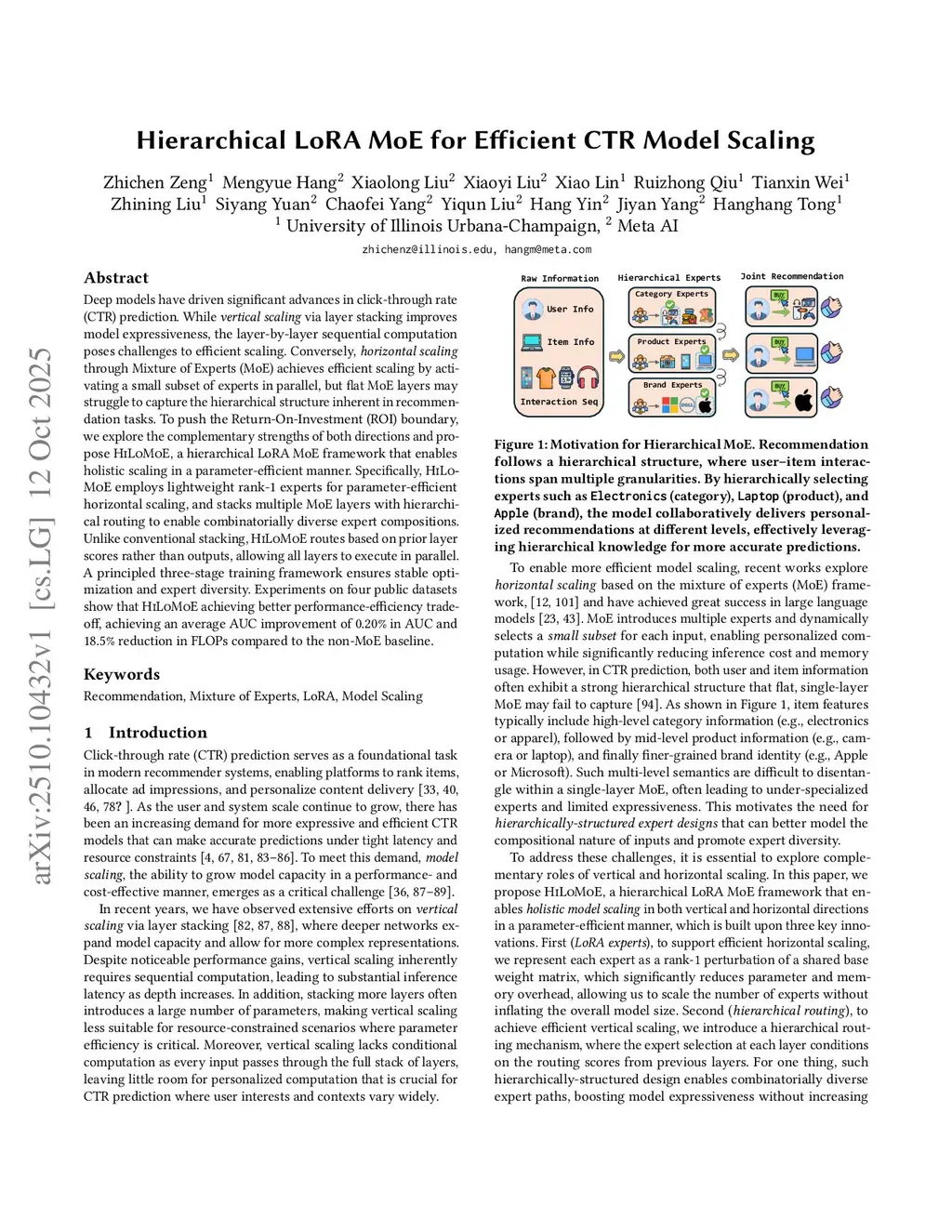 Hierarchical LoRA MoE for Efficient CTR Model Scaling