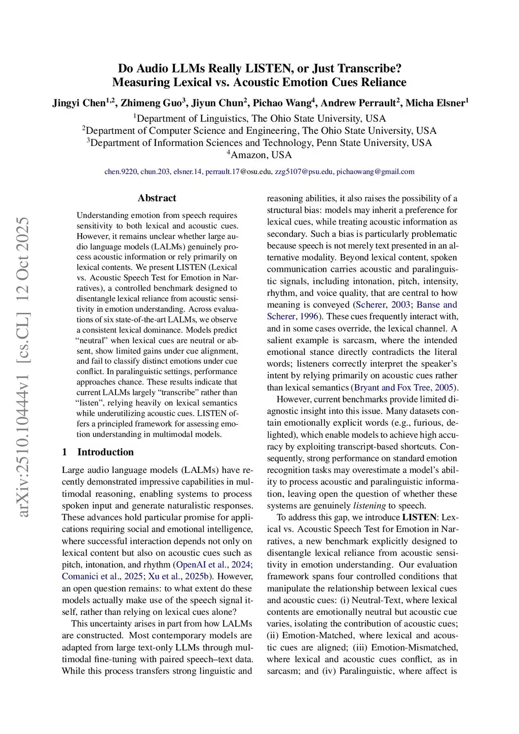 Understanding emotion from speech requires sensitivity to both lexical and acoustic cues. However, it remains unclear whether large audio language models (LALMs) genuinely process acoustic information or rely primarily on lexical content. We present LISTEN (Lexical vs. Acoustic Speech Test for Emotion in Narratives), a controlled benchmark designed to disentangle lexical reliance from acoustic sensitivity in emotion understanding. Across evaluations of six state-of-the-art LALMs, we observe a consistent lexical dominance. Models predict "neutral" when lexical cues are neutral or absent, show limited gains under cue alignment, and fail to classify distinct emotions under cue conflict. In paralinguistic settings, performance approaches chance. These results indicate that current LALMs largely "transcribe" rather than "listen," relying heavily on lexical semantics while underutilizing acoustic cues. LISTEN offers a principled framework for assessing emotion understanding in multimodal models.