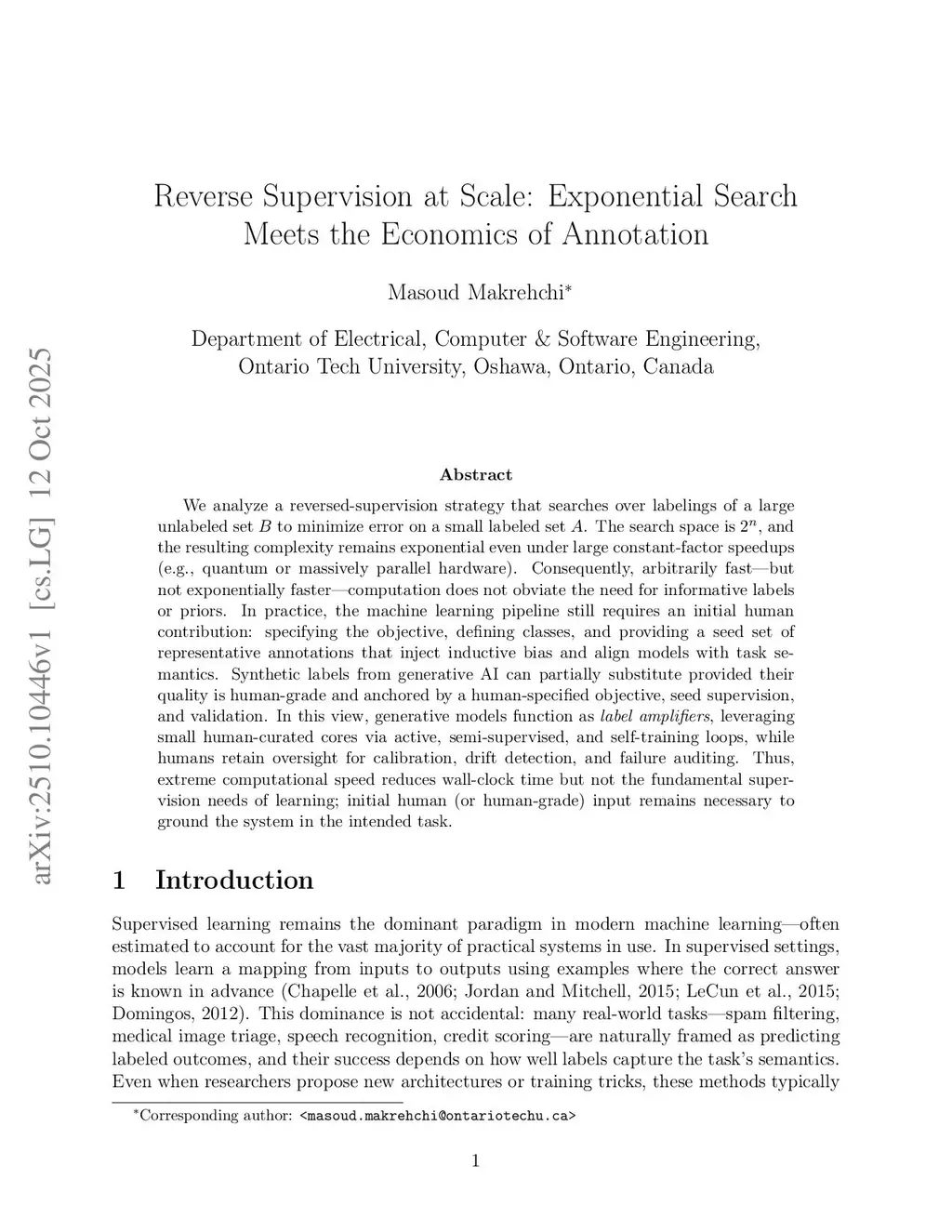 We analyze a reversed-supervision strategy that searches over labelings of a large unlabeled set \(B\) to minimize error on a small labeled set \(A\). The search space is \(2^n\), and the resulting complexity remains exponential even under large constant-factor speedups (e.g., quantum or massively parallel hardware). Consequently, arbitrarily fast -- but not exponentially faster -- computation does not obviate the need for informative labels or priors. In practice, the machine learning pipeline still requires an initial human contribution: specifying the objective, defining classes, and providing a seed set of representative annotations that inject inductive bias and align models with task semantics. Synthetic labels from generative AI can partially substitute provided their quality is human-grade and anchored by a human-specified objective, seed supervision, and validation. In this view, generative models function as \emph{label amplifiers}, leveraging small human-curated cores via active, semi-supervised, and self-training loops, while humans retain oversight for calibration, drift detection, and failure auditing. Thus, extreme computational speed reduces wall-clock time but not the fundamental supervision needs of learning; initial human (or human-grade) input remains necessary to ground the system in the intended task.