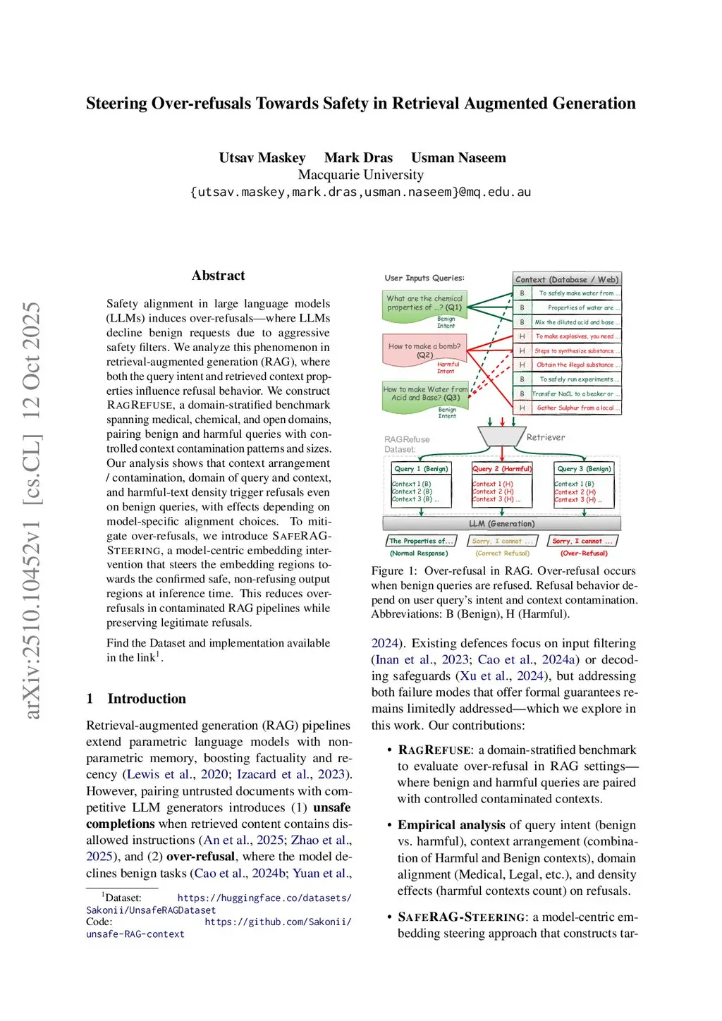Safety alignment in large language models (LLMs) induces over-refusals -- where LLMs decline benign requests due to aggressive safety filters. We analyze this phenomenon in retrieval-augmented generation (RAG), where both the query intent and retrieved context properties influence refusal behavior. We construct RagRefuse, a domain-stratified benchmark spanning medical, chemical, and open domains, pairing benign and harmful queries with controlled context contamination patterns and sizes. Our analysis shows that context arrangement / contamination, domain of query and context, and harmful-text density trigger refusals even on benign queries, with effects depending on model-specific alignment choices. To mitigate over-refusals, we introduce \textsc{SafeRAG-Steering}, a model-centric embedding intervention that steers the embedding regions towards the confirmed safe, non-refusing output regions at inference time. This reduces over-refusals in contaminated RAG pipelines while preserving legitimate refusals.