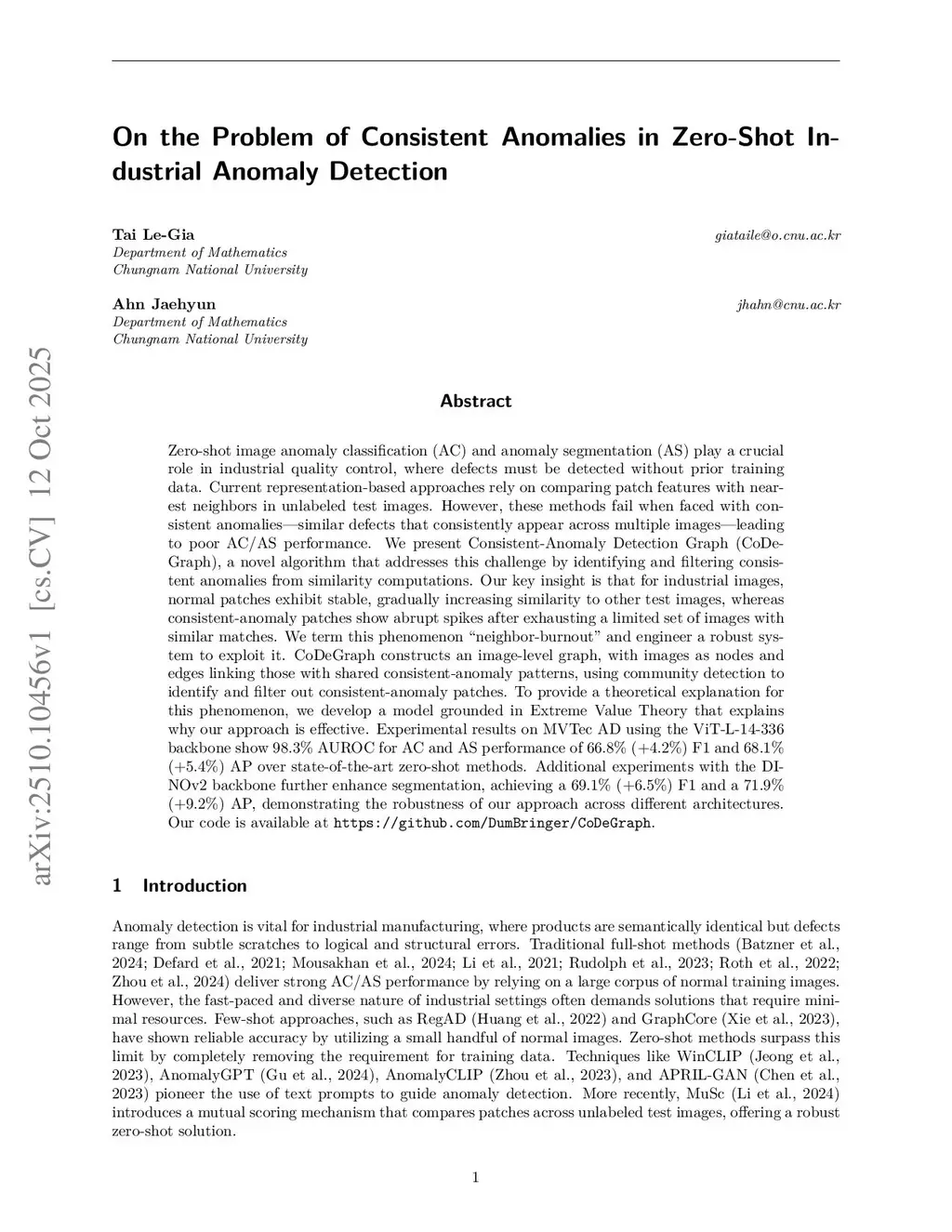 Zero-shot image anomaly classification (AC) and segmentation (AS) are vital for industrial quality control, detecting defects without prior training data. Existing representation-based methods compare patch features with nearest neighbors in unlabeled test images but struggle with consistent anomalies -- similar defects recurring across multiple images -- resulting in poor AC/AS performance. We introduce Consistent-Anomaly Detection Graph (CoDeGraph), a novel algorithm that identifies and filters consistent anomalies from similarity computations. Our key insight is that normal patches in industrial images show stable, gradually increasing similarity to other test images, while consistent-anomaly patches exhibit abrupt similarity spikes after exhausting a limited set of similar matches, a phenomenon we term ``neighbor-burnout.'' CoDeGraph constructs an image-level graph, with images as nodes and edges connecting those with shared consistent-anomaly patterns, using community detection to filter these anomalies. We provide a theoretical foundation using Extreme Value Theory to explain the effectiveness of our approach. Experiments on MVTec AD with the ViT-L-14-336 backbone achieve 98.3% AUROC for AC and AS performance of 66.8% (+4.2%) F1 and 68.1% (+5.4%) AP over state-of-the-art zero-shot methods. Using the DINOv2 backbone further improves segmentation, yielding 69.1% (+6.5%) F1 and 71.9% (+9.2%) AP, demonstrating robustness across architectures.