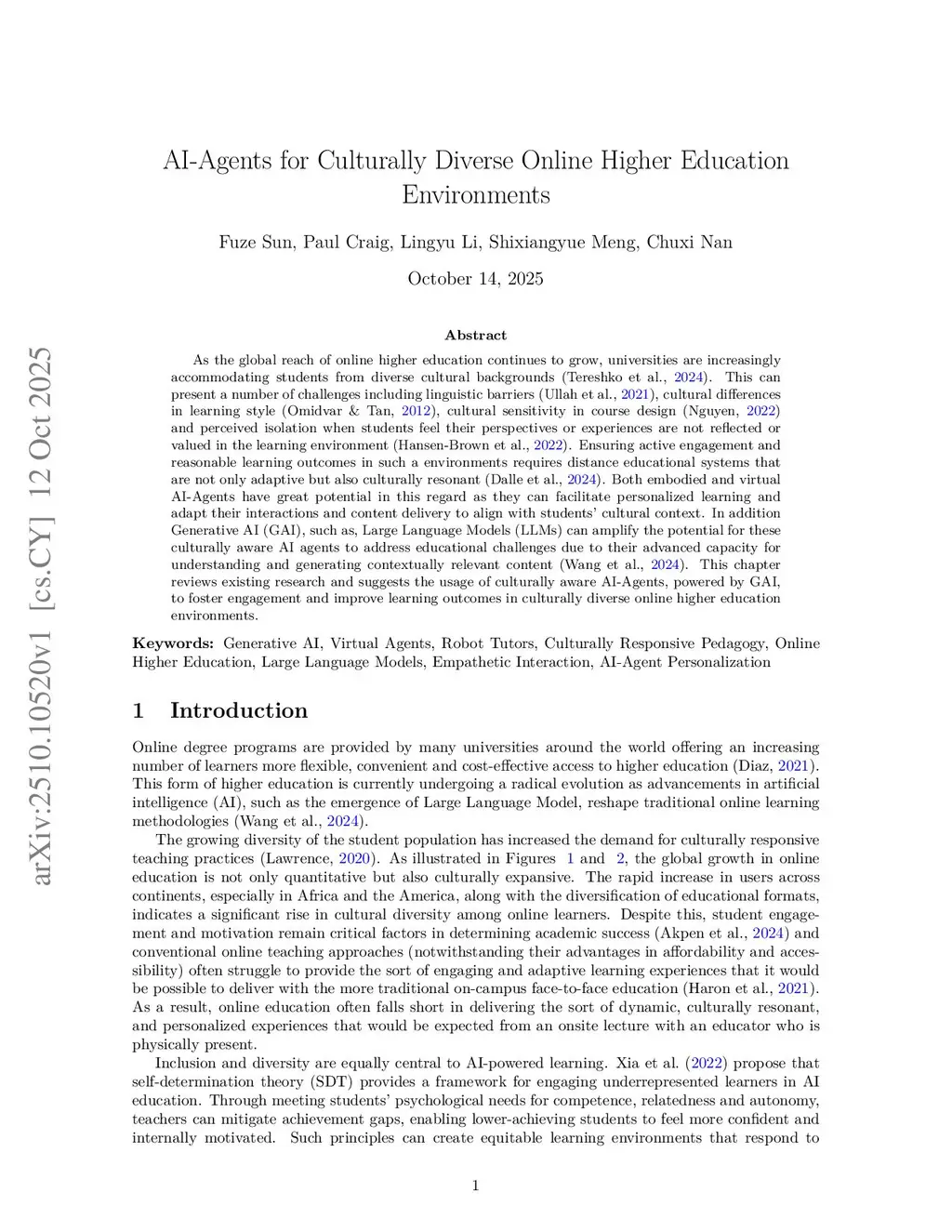 As the global reach of online higher education continues to grow, universities are increasingly accommodating students from diverse cultural backgrounds (Tereshko et al., 2024). This can present a number of challenges including linguistic barriers (Ullah et al., 2021), cultural differences in learning style (Omidvar & Tan, 2012), cultural sensitivity in course design (Nguyen, 2022) and perceived isolation when students feel their perspectives or experiences are not reflected or valued in the learning environment (Hansen-Brown et al., 2022). Ensuring active engagement and reasonable learning outcomes in such a environments requires distance educational systems that are not only adaptive but also culturally resonant (Dalle et al., 2024). Both embodied and virtual AI-Agents have great potential in this regard as they can facilitate personalized learning and adapt their interactions and content delivery to align with students' cultural context. In addition, Generative AI (GAI), such as, Large Language Models (LLMs) can amplify the potential for these culturally aware AI agents to address educational challenges due to their advanced capacity for understanding and generating contextually relevant content (Wang et al., 2024). This chapter reviews existing research and suggests the usage of culturally aware AI-Agents, powered by GAI, to foster engagement and improve learning outcomes in culturally diverse online higher education environments.