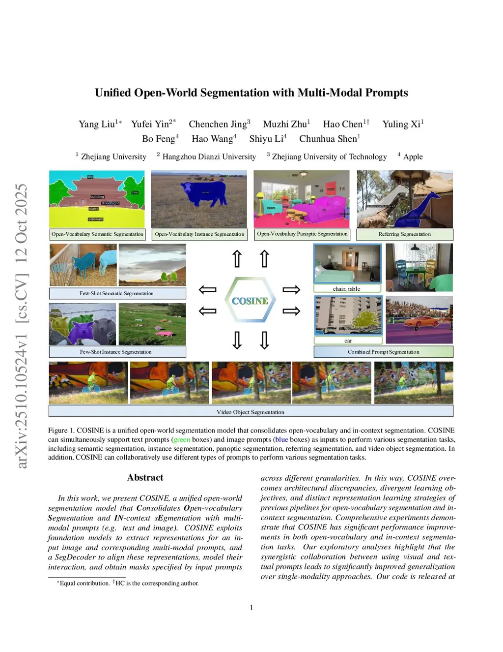 In this work, we present COSINE, a unified open-world segmentation model that consolidates open-vocabulary segmentation and in-context segmentation with multi-modal prompts (e.g., text and image). COSINE exploits foundation models to extract representations for an input image and corresponding multi-modal prompts, and a SegDecoder to align these representations, model their interaction, and obtain masks specified by input prompts across different granularities. In this way, COSINE overcomes architectural discrepancies, divergent learning objectives, and distinct representation learning strategies of previous pipelines for open-vocabulary segmentation and in-context segmentation. Comprehensive experiments demonstrate that COSINE has significant performance improvements in both open-vocabulary and in-context segmentation tasks. Our exploratory analyses highlight that the synergistic collaboration between using visual and textual prompts leads to significantly improved generalization over single-modality approaches.