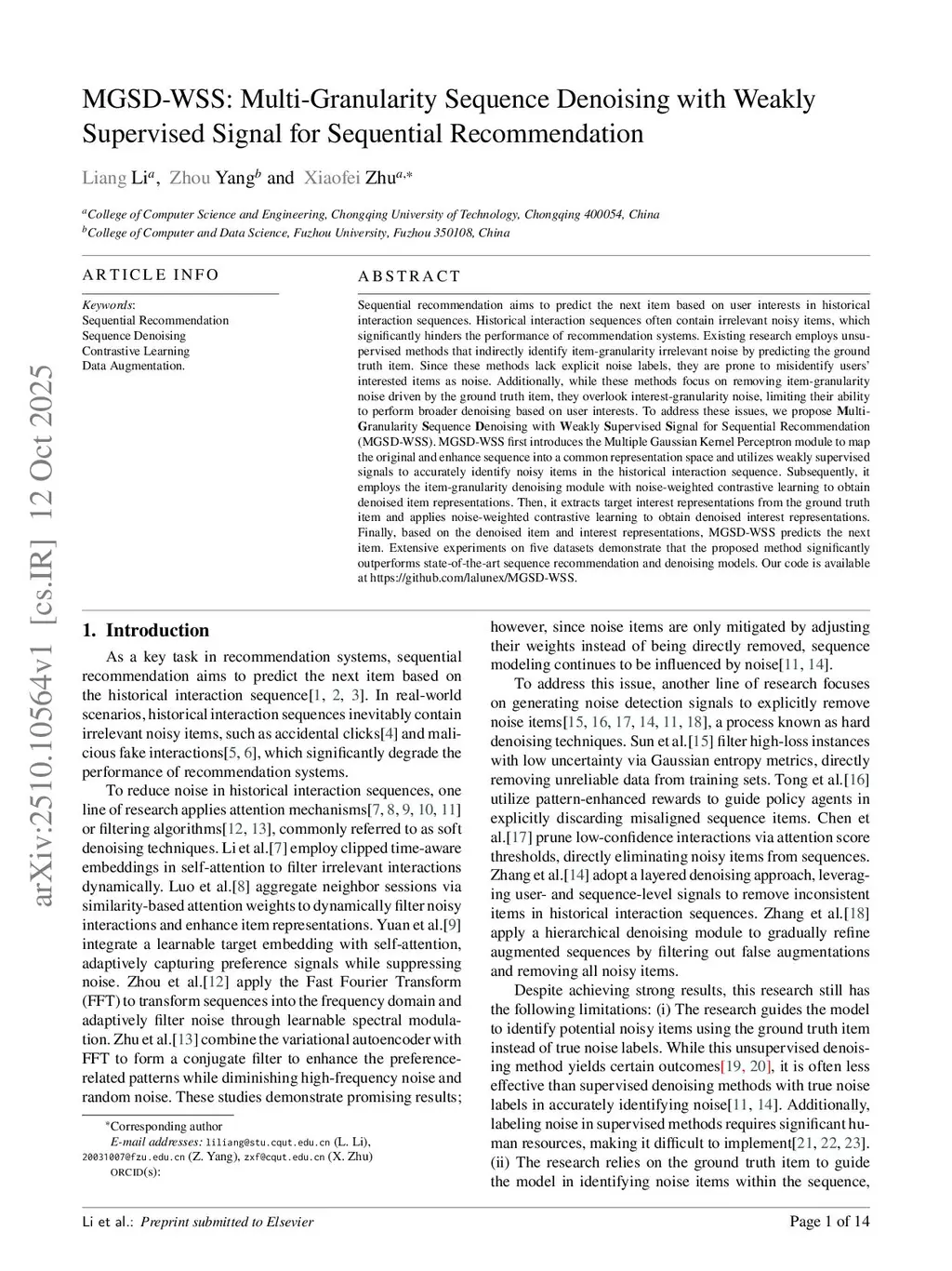 Sequential recommendation aims to predict the next item based on user interests in historical interaction sequences. Historical interaction sequences often contain irrelevant noisy items, which significantly hinders the performance of recommendation systems. Existing research employs unsupervised methods that indirectly identify item-granularity irrelevant noise by predicting the ground truth item. Since these methods lack explicit noise labels, they are prone to misidentify users' interested items as noise. Additionally, while these methods focus on removing item-granularity noise driven by the ground truth item, they overlook interest-granularity noise, limiting their ability to perform broader denoising based on user interests. To address these issues, we propose Multi-Granularity Sequence Denoising with Weakly Supervised Signal for Sequential Recommendation(MGSD-WSS). MGSD-WSS first introduces the Multiple Gaussian Kernel Perceptron module to map the original and enhance sequence into a common representation space and utilizes weakly supervised signals to accurately identify noisy items in the historical interaction sequence. Subsequently, it employs the item-granularity denoising module with noise-weighted contrastive learning to obtain denoised item representations. Then, it extracts target interest representations from the ground truth item and applies noise-weighted contrastive learning to obtain denoised interest representations. Finally, based on the denoised item and interest representations, MGSD-WSS predicts the next item. Extensive experiments on five datasets demonstrate that the proposed method significantly outperforms state-of-the-art sequence recommendation and denoising models. Our code is available atthis https URL.