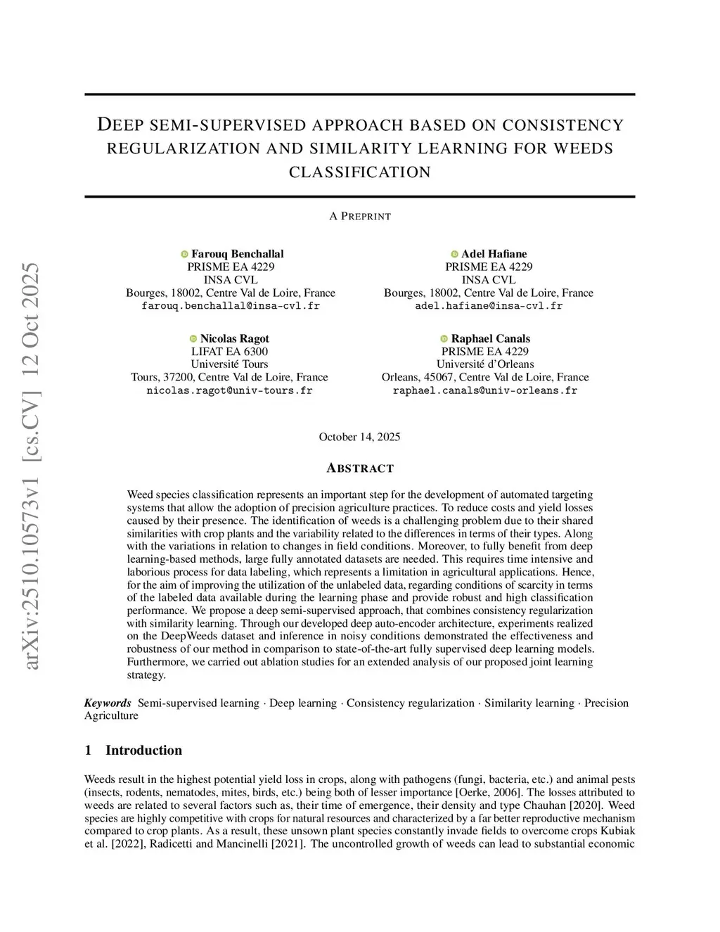 Deep semi-supervised approach based on consistency regularization and similarity learning for weeds classification