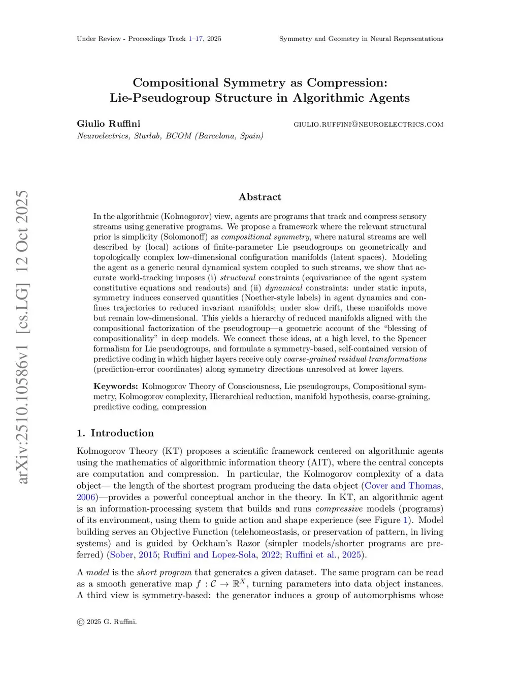 In the algorithmic (Kolmogorov) view, agents are programs that track and compress sensory streams using generative programs. We propose a framework where the relevant structural prior is simplicity (Solomonoff) understood as \emph{compositional symmetry}: natural streams are well described by (local) actions of finite-parameter Lie pseudogroups on geometrically and topologically complex low-dimensional configuration manifolds (latent spaces). Modeling the agent as a generic neural dynamical system coupled to such streams, we show that accurate world-tracking imposes (i) \emph{structural constraints} -- equivariance of the agent's constitutive equations and readouts -- and (ii) \emph{dynamical constraints}: under static inputs, symmetry induces conserved quantities (Noether-style labels) in the agent dynamics and confines trajectories to reduced invariant manifolds; under slow drift, these manifolds move but remain low-dimensional. This yields a hierarchy of reduced manifolds aligned with the compositional factorization of the pseudogroup, providing a geometric account of the ``blessing of compositionality'' in deep models. We connect these ideas to the Spencer formalism for Lie pseudogroups and formulate a symmetry-based, self-contained version of predictive coding in which higher layers receive only \emph{coarse-grained residual transformations} (prediction-error coordinates) along symmetry directions unresolved at lower layers.