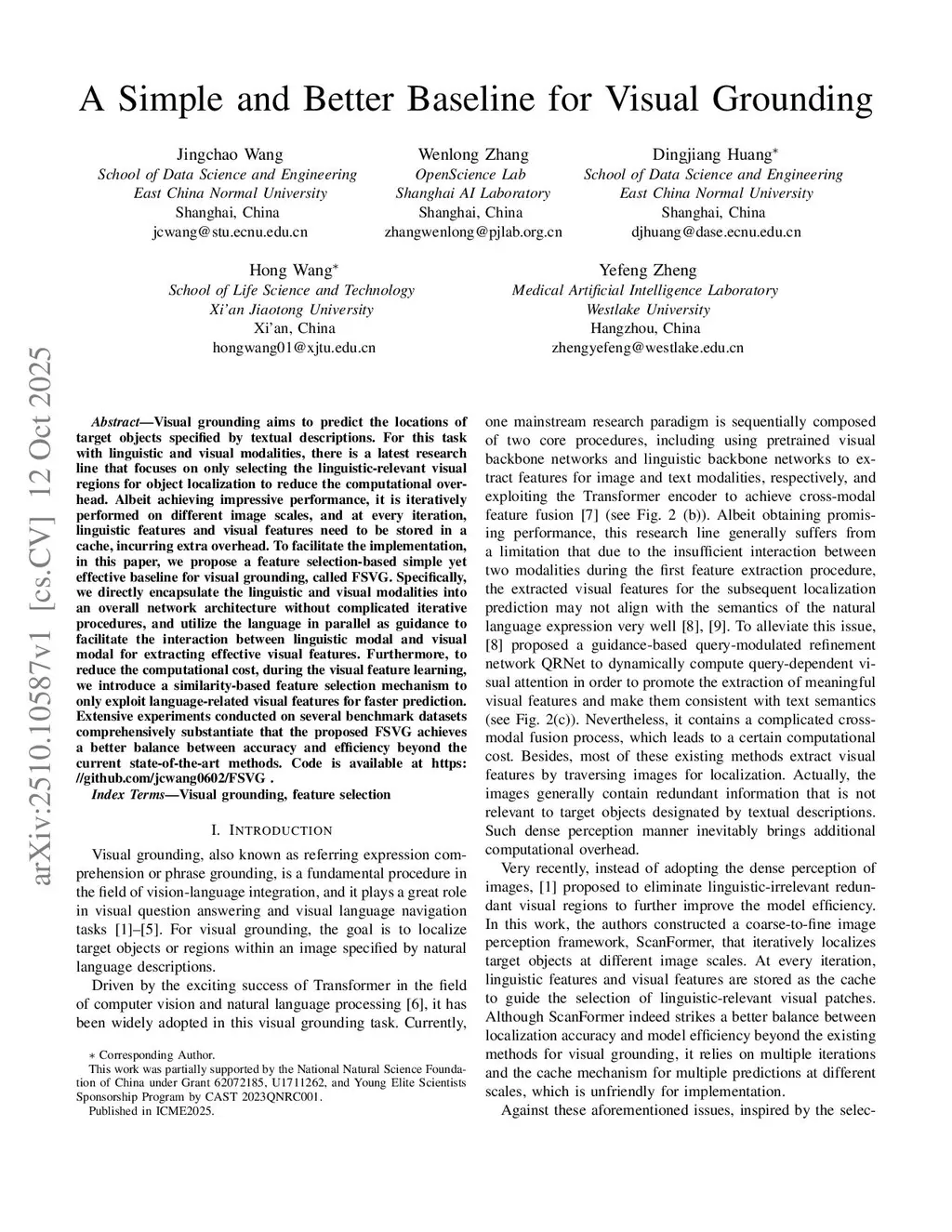 Visual grounding aims to predict the locations of target objects specified by textual descriptions. For this task with linguistic and visual modalities, there is a latest research line that focuses on only selecting the linguistic-relevant visual regions for object localization to reduce the computational overhead. Albeit achieving impressive performance, it is iteratively performed on different image scales, and at every iteration, linguistic features and visual features need to be stored in a cache, incurring extra overhead. To facilitate the implementation, in this paper, we propose a feature selection-based simple yet effective baseline for visual grounding, called FSVG. Specifically, we directly encapsulate the linguistic and visual modalities into an overall network architecture without complicated iterative procedures, and utilize the language in parallel as guidance to facilitate the interaction between linguistic modal and visual modal for extracting effective visual features. Furthermore, to reduce the computational cost, during the visual feature learning, we introduce a similarity-based feature selection mechanism to only exploit language-related visual features for faster prediction. Extensive experiments conducted on several benchmark datasets comprehensively substantiate that the proposed FSVG achieves a better balance between accuracy and efficiency beyond the current state-of-the-art methods. Code is available atthis https URL.