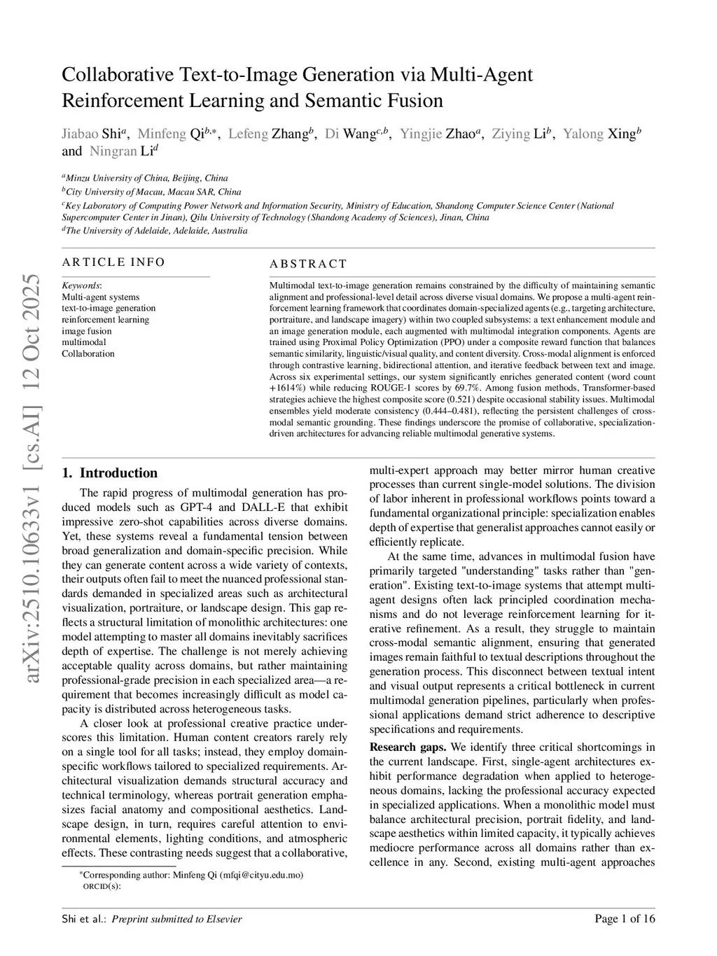 Multimodal text-to-image generation remains constrained by the difficulty of maintaining semantic alignment and professional-level detail across diverse visual domains. We propose a multi-agent reinforcement learning framework that coordinates domain-specialized agents (e.g., focused on architecture, portraiture, and landscape imagery) within two coupled subsystems: a text enhancement module and an image generation module, each augmented with multimodal integration components. Agents are trained using Proximal Policy Optimization (PPO) under a composite reward function that balances semantic similarity, linguistic visual quality, and content diversity. Cross-modal alignment is enforced through contrastive learning, bidirectional attention, and iterative feedback between text and image. Across six experimental settings, our system significantly enriches generated content (word count increased by 1614%) while reducing ROUGE-1 scores by 69.7%. Among fusion methods, Transformer-based strategies achieve the highest composite score (0.521), despite occasional stability issues. Multimodal ensembles yield moderate consistency (ranging from 0.444 to 0.481), reflecting the persistent challenges of cross-modal semantic grounding. These findings underscore the promise of collaborative, specialization-driven architectures for advancing reliable multimodal generative systems.