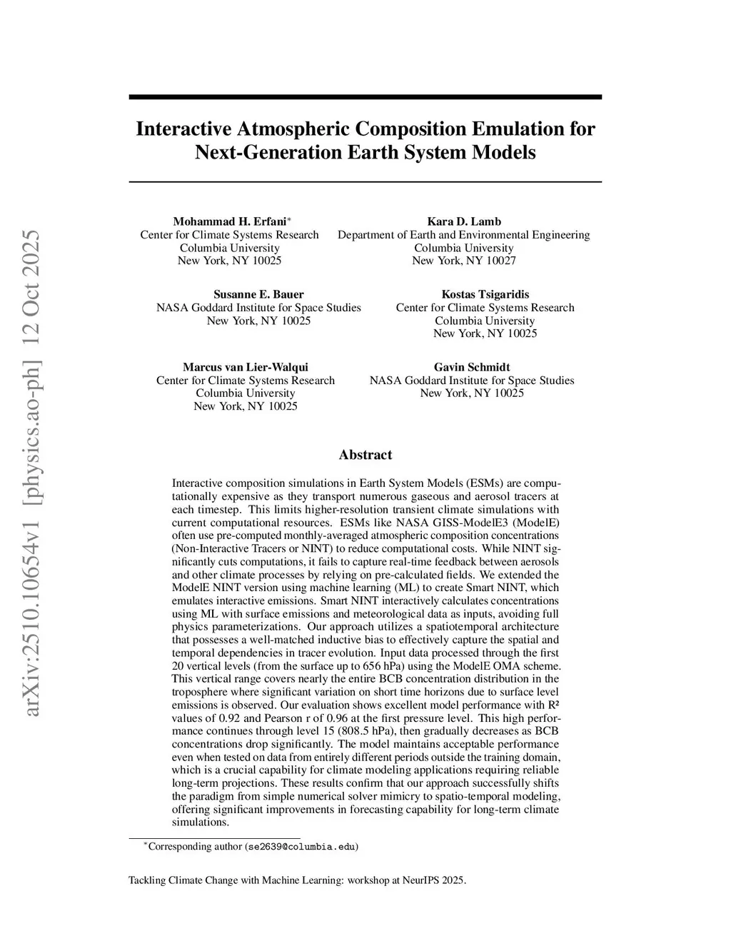 Interactive composition simulations in Earth System Models (ESMs) are computationally expensive as they transport numerous gaseous and aerosol tracers at each timestep. This limits higher-resolution transient climate simulations with current computational resources. ESMs like NASA GISS-ModelE3 (ModelE) often use pre-computed monthly-averaged atmospheric composition concentrations (Non-Interactive Tracers or NINT) to reduce computational costs. While NINT significantly cuts computations, it fails to capture real-time feedback between aerosols and other climate processes by relying on pre-calculated fields. We extended the ModelE NINT version using machine learning (ML) to create Smart NINT, which emulates interactive emissions. Smart NINT interactively calculates concentrations using ML with surface emissions and meteorological data as inputs, avoiding full physics parameterizations. Our approach utilizes a spatiotemporal architecture that possesses a well-matched inductive bias to effectively capture the spatial and temporal dependencies in tracer evolution. Input data processed through the first 20 vertical levels (from the surface up to 656 hPa) using the ModelE OMA scheme. This vertical range covers nearly the entire BCB concentration distribution in the troposphere, where significant variation on short time horizons due to surface-level emissions is observed. Our evaluation shows excellent model performance with R-squared values of 0.92 and Pearson-r of 0.96 at the first pressure level. This high performance continues through level 15 (808.5 hPa), then gradually decreases as BCB concentrations drop significantly. The model maintains acceptable performance even when tested on data from entirely different periods outside the training domain, which is a crucial capability for climate modeling applications requiring reliable long-term projections.