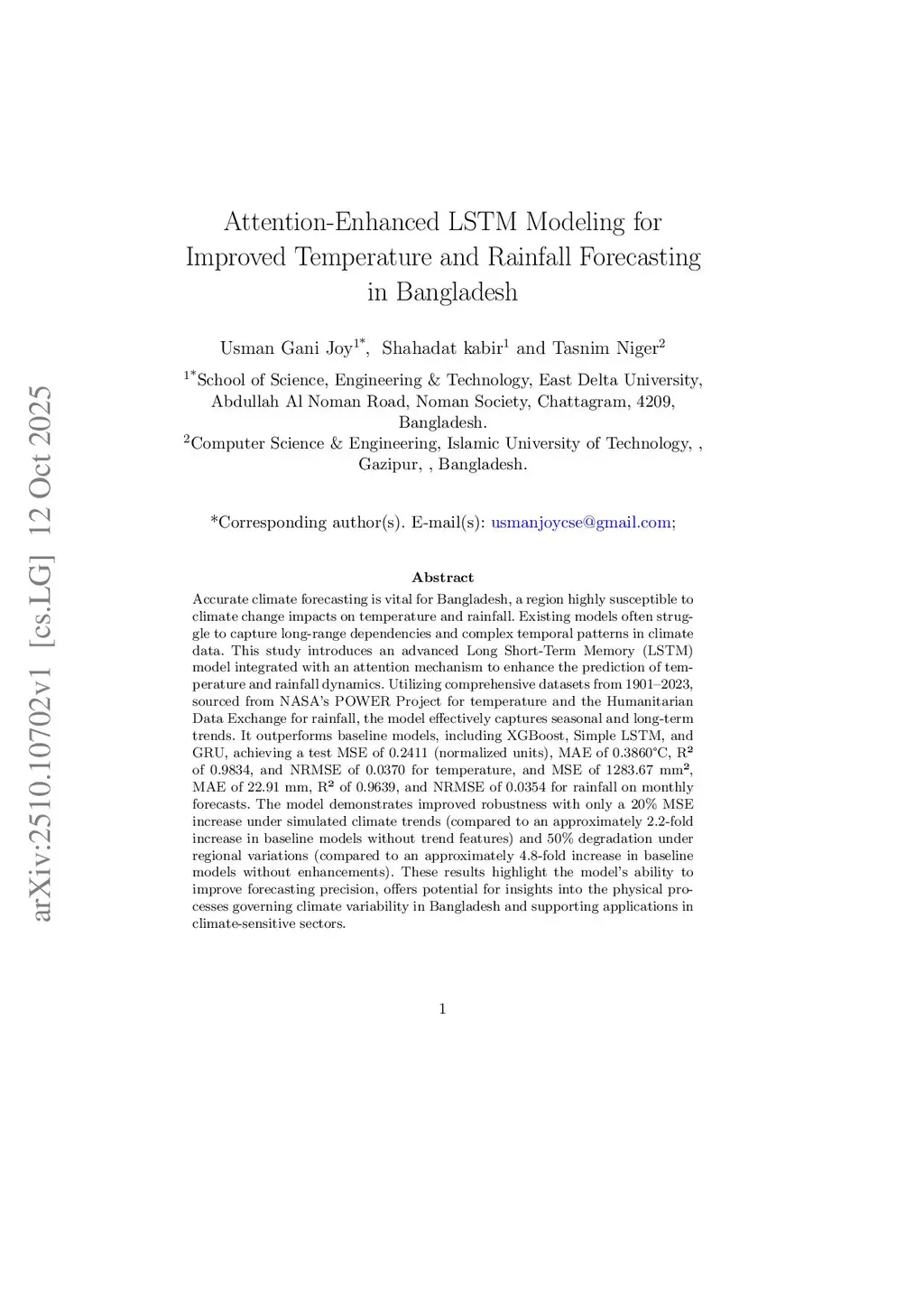 Attention-Enhanced LSTM Modeling for Improved Temperature and Rainfall Forecasting in Bangladesh