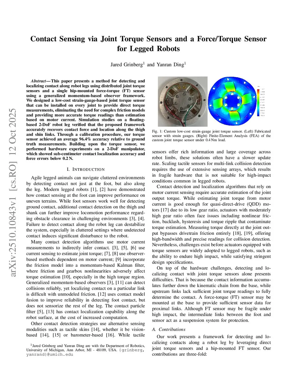 This paper presents a method for detecting and localizing contact along robot legs using distributed joint torque sensors and a single hip-mounted force-torque (FT) sensor using a generalized momentum-based observer framework. We designed a low-cost strain-gauge-based joint torque sensor that can be installed on every joint to provide direct torque measurements, eliminating the need for complex friction models and providing more accurate torque readings than estimation based on motor current. Simulation studies on a floating-based 2-DoF robot leg verified that the proposed framework accurately recovers contact force and location along the thigh and shin links. Through a calibration procedure, our torque sensor achieved an average 96.4% accuracy relative to ground truth measurements. Building upon the torque sensor, we performed hardware experiments on a 2-DoF manipulator, which showed sub-centimeter contact localization accuracy and force errors below 0.2 N.