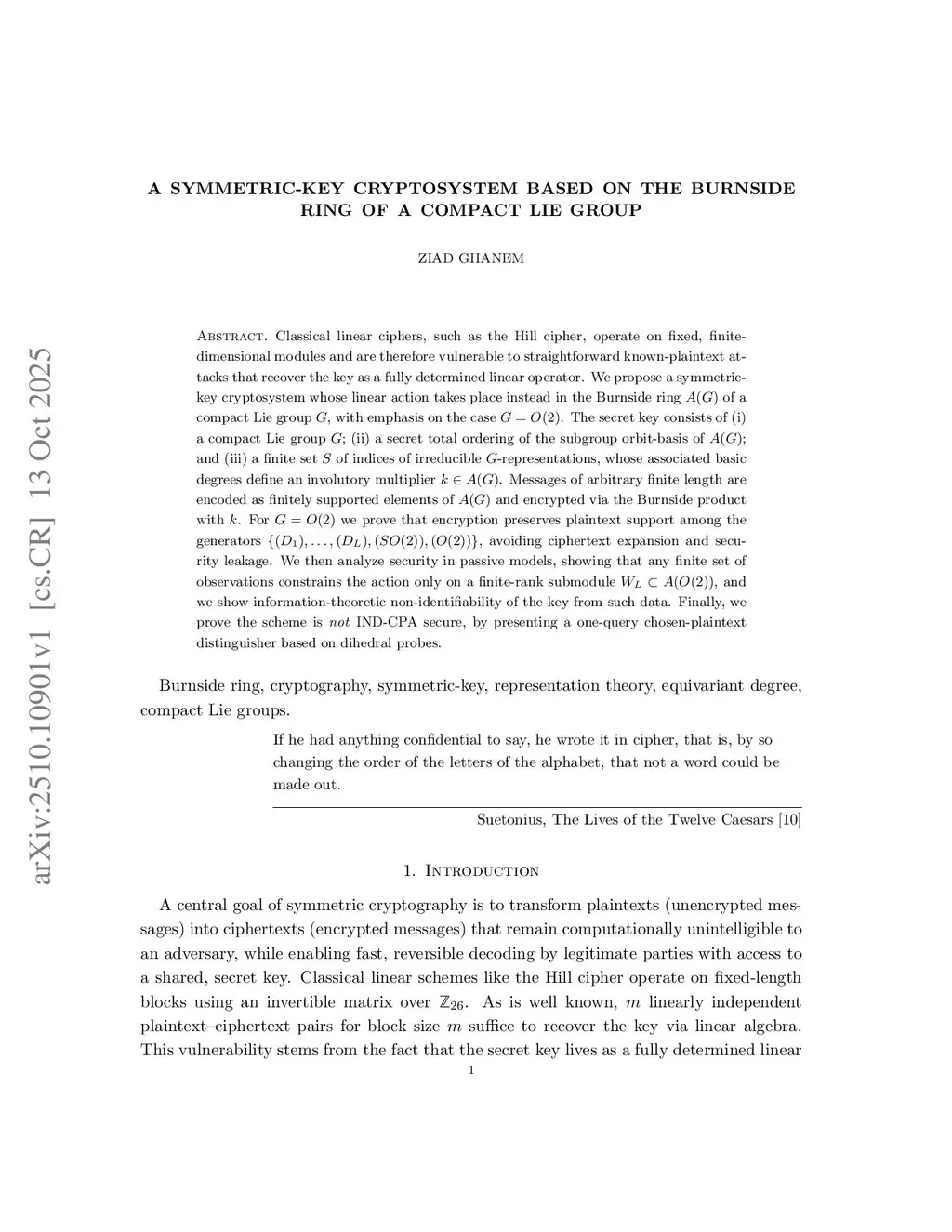 Classical linear ciphers, such as the Hill cipher, operate on fixed, finite-dimensional modules and are therefore vulnerable to straightforward known-plaintext attacks that recover the key as a fully determined linear operator. We propose a symmetric-key cryptosystem whose linear action takes place instead in the Burnside ring of a compact Lie group , with emphasis on the case . The secret key consists of (i) a compact Lie group ; (ii) a secret total ordering of the subgroup orbit-basis of ; and (iii) a finite set of indices of irreducible -representations, whose associated basic degrees define an involutory multiplier . Messages of arbitrary finite length are encoded as finitely supported elements of and encrypted via the Burnside product with . For we prove that encryption preserves plaintext support among the generators , avoiding ciphertext expansion and security leakage. We then analyze security in passive models, showing that any finite set of observations constrains the action only on a finite-rank submodule , and we show information-theoretic non-identifiability of the key from such data. Finally, we prove the scheme is \emph{not} IND-CPA secure, by presenting a one-query chosen-plaintext distinguisher based on dihedral probes.