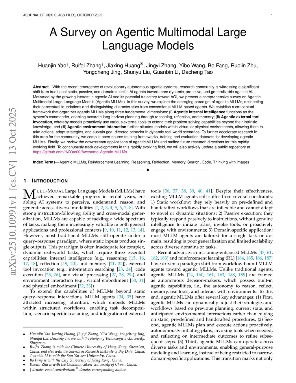 With the recent emergence of revolutionary autonomous agentic systems, research community is witnessing a significant shift from traditional static, passive, and domain-specific AI agents toward more dynamic, proactive, and generalizable agentic AI. Motivated by the growing interest in agentic AI and its potential trajectory toward AGI, we present a comprehensive survey on Agentic Multimodal Large Language Models (Agentic MLLMs). In this survey, we explore the emerging paradigm of agentic MLLMs, delineating their conceptual foundations and distinguishing characteristics from conventional MLLM-based agents. We establish a conceptual framework that organizes agentic MLLMs along three fundamental dimensions: (i) Agentic internal intelligence functions as the system's commander, enabling accurate long-horizon planning through reasoning, reflection, and memory; (ii) Agentic external tool invocation, whereby models proactively use various external tools to extend their problem-solving capabilities beyond their intrinsic knowledge; and (iii) Agentic environment interaction further situates models within virtual or physical environments, allowing them to take actions, adapt strategies, and sustain goal-directed behavior in dynamic real-world scenarios. To further accelerate research in this area for the community, we compile open-source training frameworks, training and evaluation datasets for developing agentic MLLMs. Finally, we review the downstream applications of agentic MLLMs and outline future research directions for this rapidly evolving field. To continuously track developments in this rapidly evolving field, we will also actively update a public repository atthis https URL.