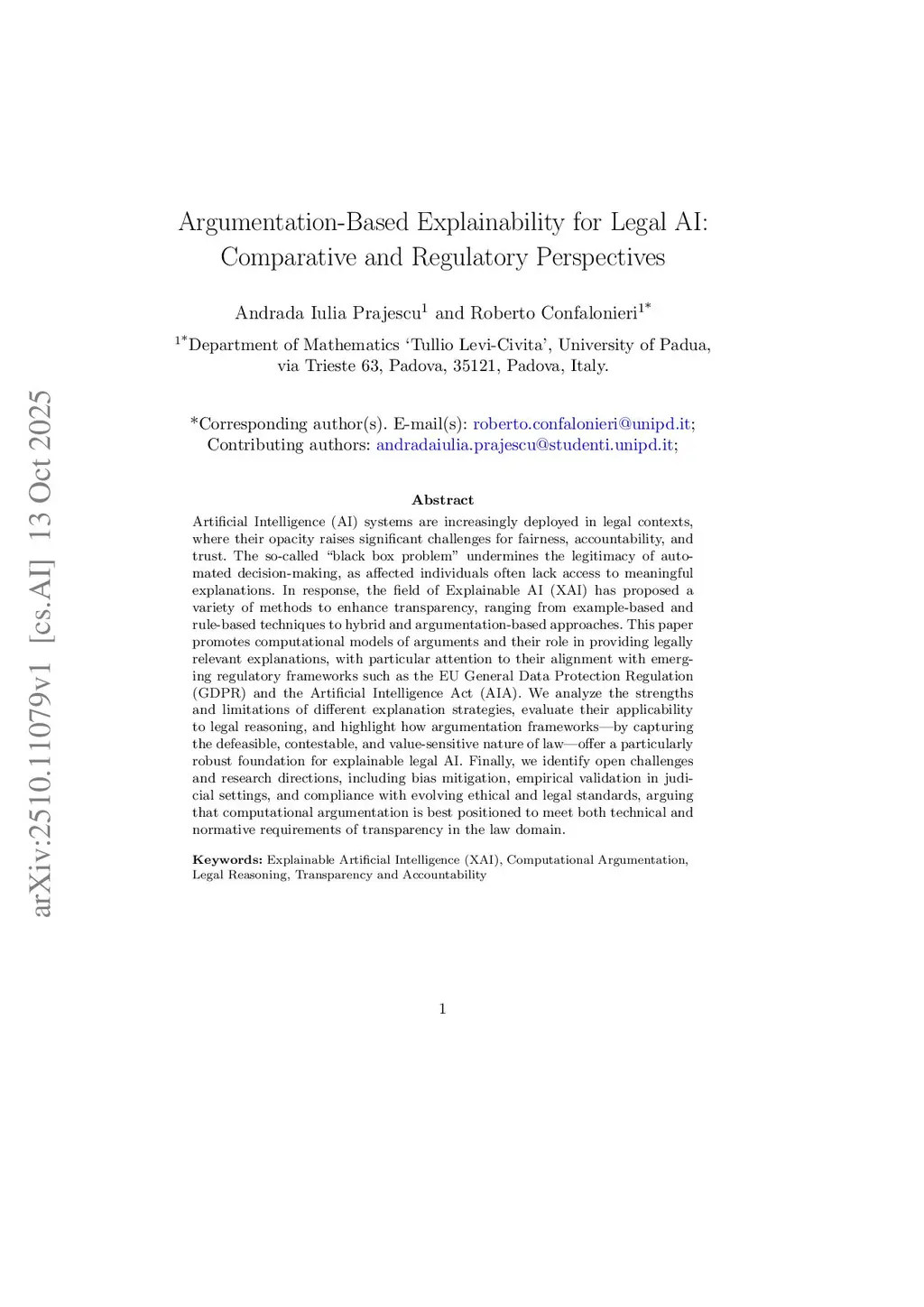 Artificial Intelligence (AI) systems are increasingly deployed in legal contexts, where their opacity raises significant challenges for fairness, accountability, and trust. The so-called ``black box problem'' undermines the legitimacy of automated decision-making, as affected individuals often lack access to meaningful explanations. In response, the field of Explainable AI (XAI) has proposed a variety of methods to enhance transparency, ranging from example-based and rule-based techniques to hybrid and argumentation-based approaches. This paper promotes computational models of arguments and their role in providing legally relevant explanations, with particular attention to their alignment with emerging regulatory frameworks such as the EU General Data Protection Regulation (GDPR) and the Artificial Intelligence Act (AIA). We analyze the strengths and limitations of different explanation strategies, evaluate their applicability to legal reasoning, and highlight how argumentation frameworks -- by capturing the defeasible, contestable, and value-sensitive nature of law -- offer a particularly robust foundation for explainable legal AI. Finally, we identify open challenges and research directions, including bias mitigation, empirical validation in judicial settings, and compliance with evolving ethical and legal standards, arguing that computational argumentation is best positioned to meet both technical and normative requirements of transparency in the law domain.