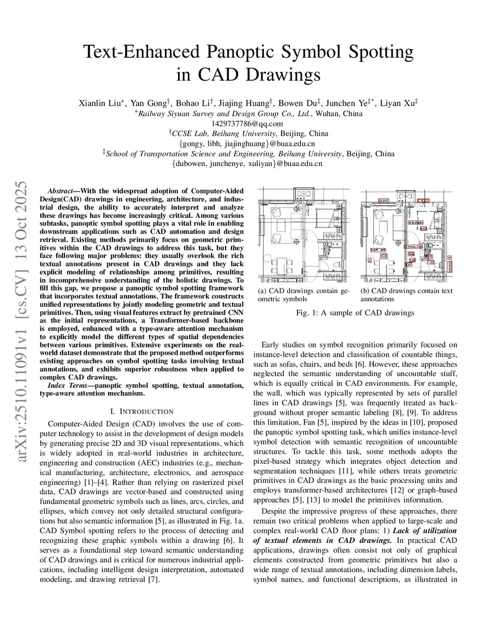 With the widespread adoption of Computer-Aided Design(CAD) drawings in engineering, architecture, and industrial design, the ability to accurately interpret and analyze these drawings has become increasingly critical. Among various subtasks, panoptic symbol spotting plays a vital role in enabling downstream applications such as CAD automation and design retrieval. Existing methods primarily focus on geometric primitives within the CAD drawings to address this task, but they face following major problems: they usually overlook the rich textual annotations present in CAD drawings and they lack explicit modeling of relationships among primitives, resulting in incomprehensive understanding of the holistic drawings. To fill this gap, we propose a panoptic symbol spotting framework that incorporates textual annotations. The framework constructs unified representations by jointly modeling geometric and textual primitives. Then, using visual features extract by pretrained CNN as the initial representations, a Transformer-based backbone is employed, enhanced with a type-aware attention mechanism to explicitly model the different types of spatial dependencies between various primitives. Extensive experiments on the real-world dataset demonstrate that the proposed method outperforms existing approaches on symbol spotting tasks involving textual annotations, and exhibits superior robustness when applied to complex CAD drawings.