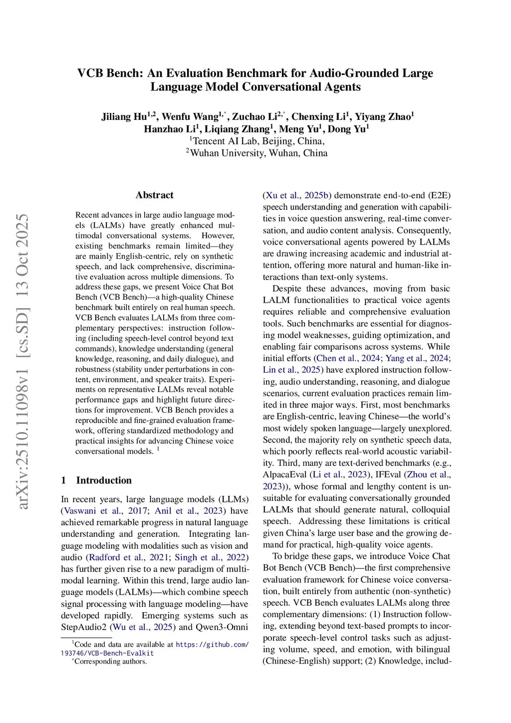 Recent advances in large audio language models (LALMs) have greatly enhanced multimodal conversational systems. However, existing benchmarks remain limited -- they are mainly English-centric, rely on synthetic speech, and lack comprehensive, discriminative evaluation across multiple dimensions. To address these gaps, we present Voice Chat Bot Bench (VCB Bench) -- a high-quality Chinese benchmark built entirely on real human speech. VCB Bench evaluates LALMs from three complementary perspectives: instruction following (including speech-level control beyond text commands), knowledge understanding (general knowledge, reasoning, and daily dialogue), and robustness (stability under perturbations in content, environment, and speaker traits). Experiments on representative LALMs reveal notable performance gaps and highlight future directions for improvement. VCB Bench provides a reproducible and fine-grained evaluation framework, offering standardized methodology and practical insights for advancing Chinese voice conversational models.