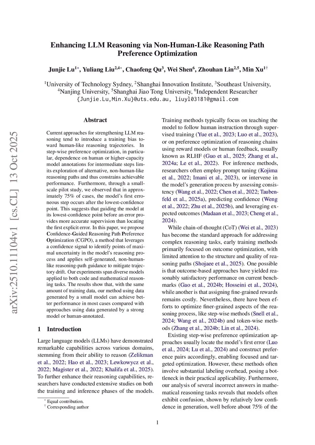 Current approaches for strengthening LLM reasoning tend to introduce a training bias toward human-like reasoning trajectories. In step-wise preference optimization, in particular, dependence on human or higher-capacity model annotations for intermediate steps limits exploration of alternative, non-human-like reasoning paths and thus constrains achievable performance. Furthermore, through a small-scale pilot study, we observed that in approximately 75% of cases, the model's first erroneous step occurs after the lowest-confidence point. This suggests that guiding the model at its lowest-confidence point before an error provides more accurate supervision than locating the first explicit error. In this paper, we propose Confidence-Guided Reasoning Path Preference Optimization (CGPO), a method that leverages a confidence signal to identify points of maximal uncertainty in the model's reasoning process and applies self-generated, non-human-like reasoning-path guidance to mitigate trajectory drift. Our experiments span diverse models applied to both code and mathematical reasoning tasks. The results show that, with the same amount of training data, our method using data generated by a small model can achieve better performance in most cases compared with approaches using data generated by a strong model or human-annotated.
