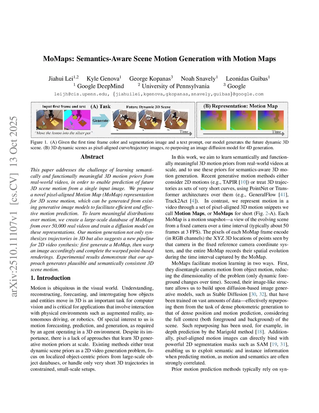 This paper addresses the challenge of learning semantically and functionally meaningful 3D motion priors from real-world videos, in order to enable prediction of future 3D scene motion from a single input image. We propose a novel pixel-aligned Motion Map (MoMap) representation for 3D scene motion, which can be generated from existing generative image models to facilitate efficient and effective motion prediction. To learn meaningful distributions over motion, we create a large-scale database of MoMaps from over 50,000 real videos and train a diffusion model on these representations. Our motion generation not only synthesizes trajectories in 3D but also suggests a new pipeline for 2D video synthesis: first generate a MoMap, then warp an image accordingly and complete the warped point-based renderings. Experimental results demonstrate that our approach generates plausible and semantically consistent 3D scene motion.